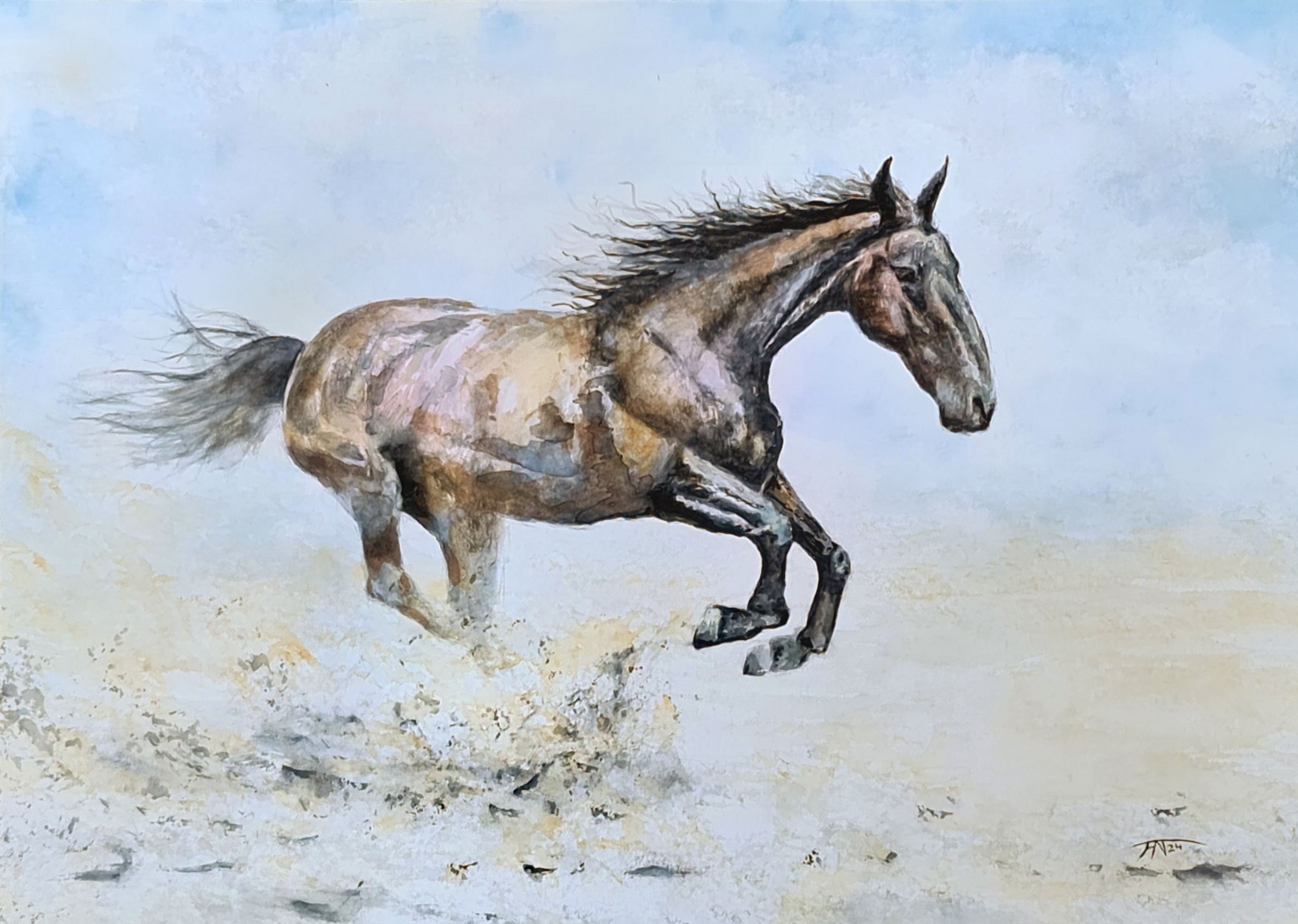 Paarden zijn prachtige dieren. Vooral als ze in het wild vrij zijn. Dit paard rent er behoorlijk op los. Het schilderij is met aquarel verf losjes opgezet.