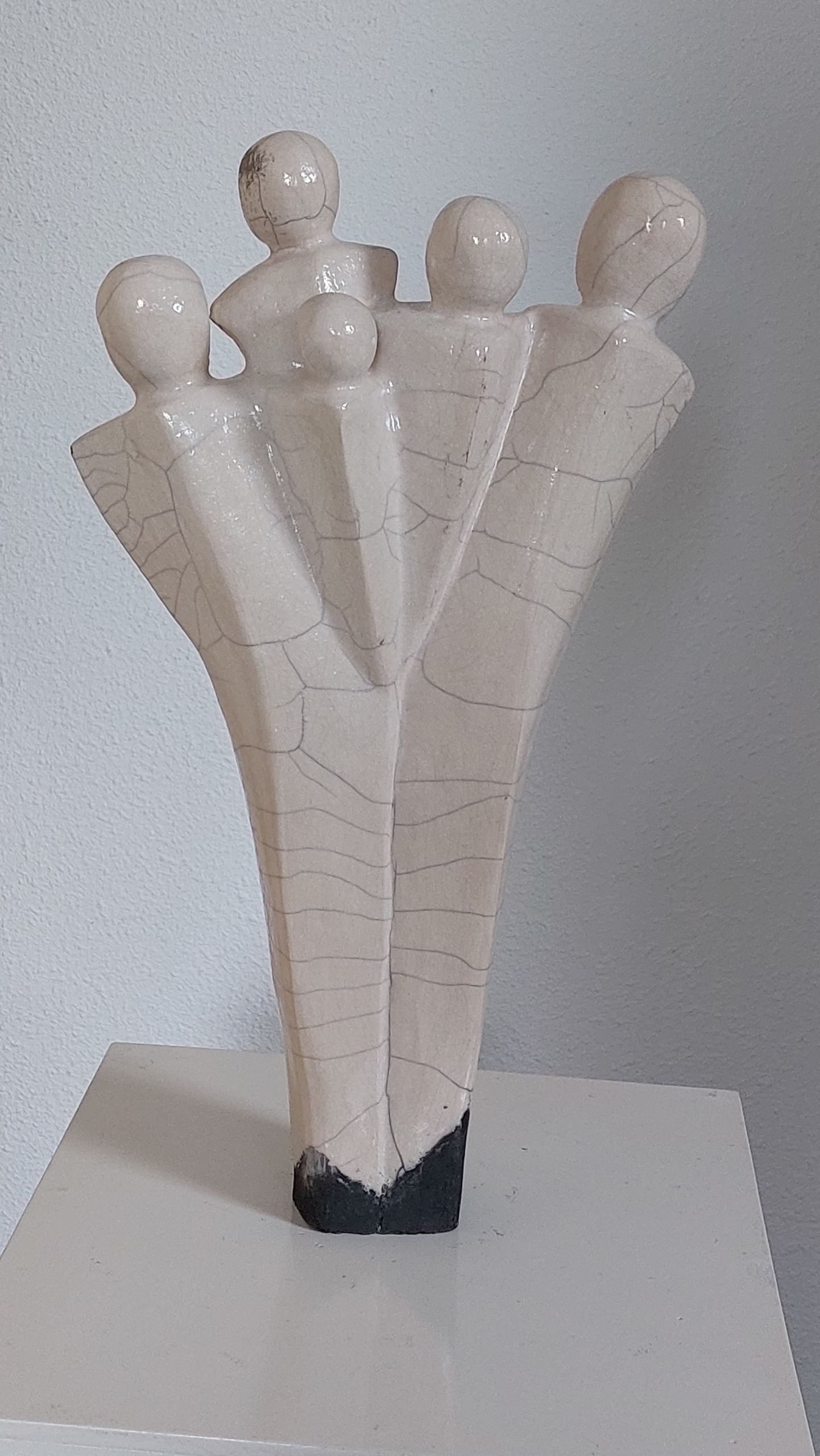 Een moderne versie van een gezin. Het beeld is van fijne charmotte en raku-gestookt.