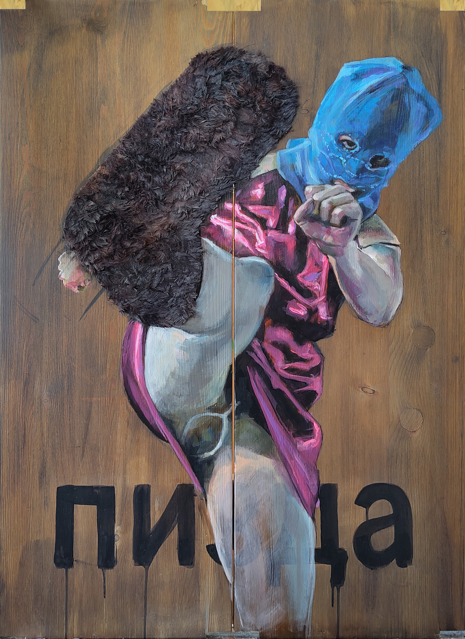 83 x 60 cm, acryl en stof op 2 boekenplanken. Eerbetoon aan alle Pussy Riot-leden. Pussy Riot is een Russische feministische punkrock-protestgroep, opgericht in 2011 in Moskou. De groep staat bekend om hun provocerende optredens tegen de Russische overheid en president Vladimir Poetin. Internationaal bekend werden ze in 2012 door hun 'punkgebed' in een kathedraal, wat leidde tot de arrestatie en veroordeling van drie leden. Ze gebruiken muziek en kunst om sociale en politieke verandering te bevorderen, met aandacht voor feminisme, LGBTQ+-rechten en mensenrechten. Ondanks hun controversiële en vaak gevaarlijke acties blijven ze een belangrijk symbool van verzet tegen autoritarisme.