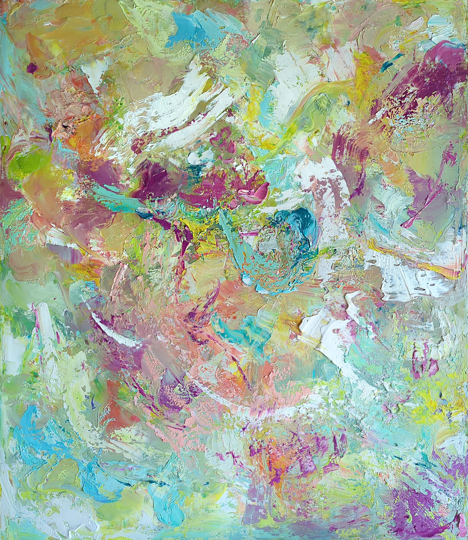 Abstract kunstwerk in olieverf op linnen doek, zacht kleuren, dynamische textuur