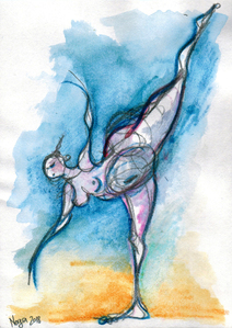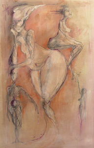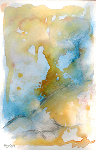 Abstracte aquarelwash waar figuratieve lijnen in geweven zijn. Nog niet ingelijst.