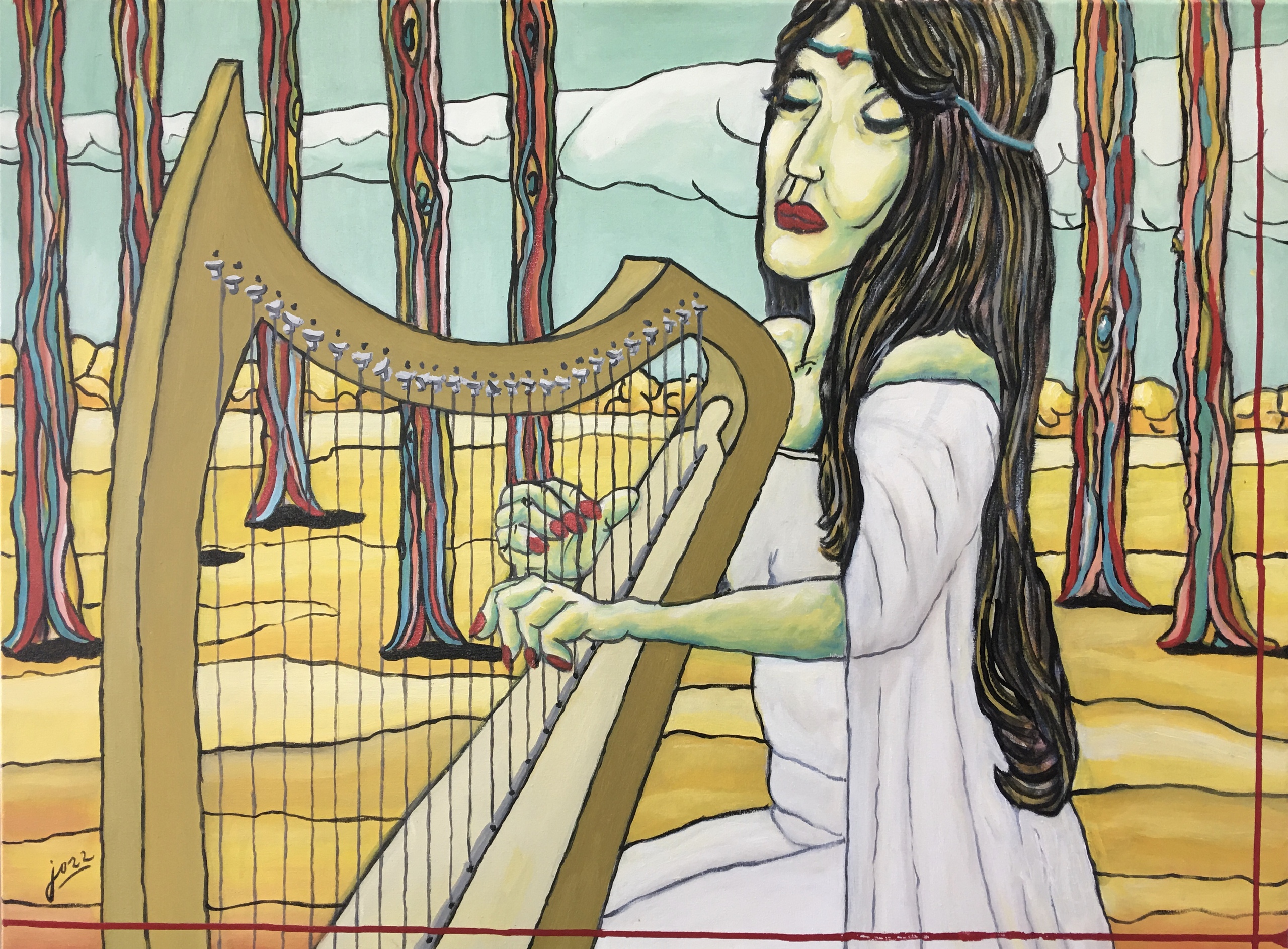 Fralalai playing harp in the wood