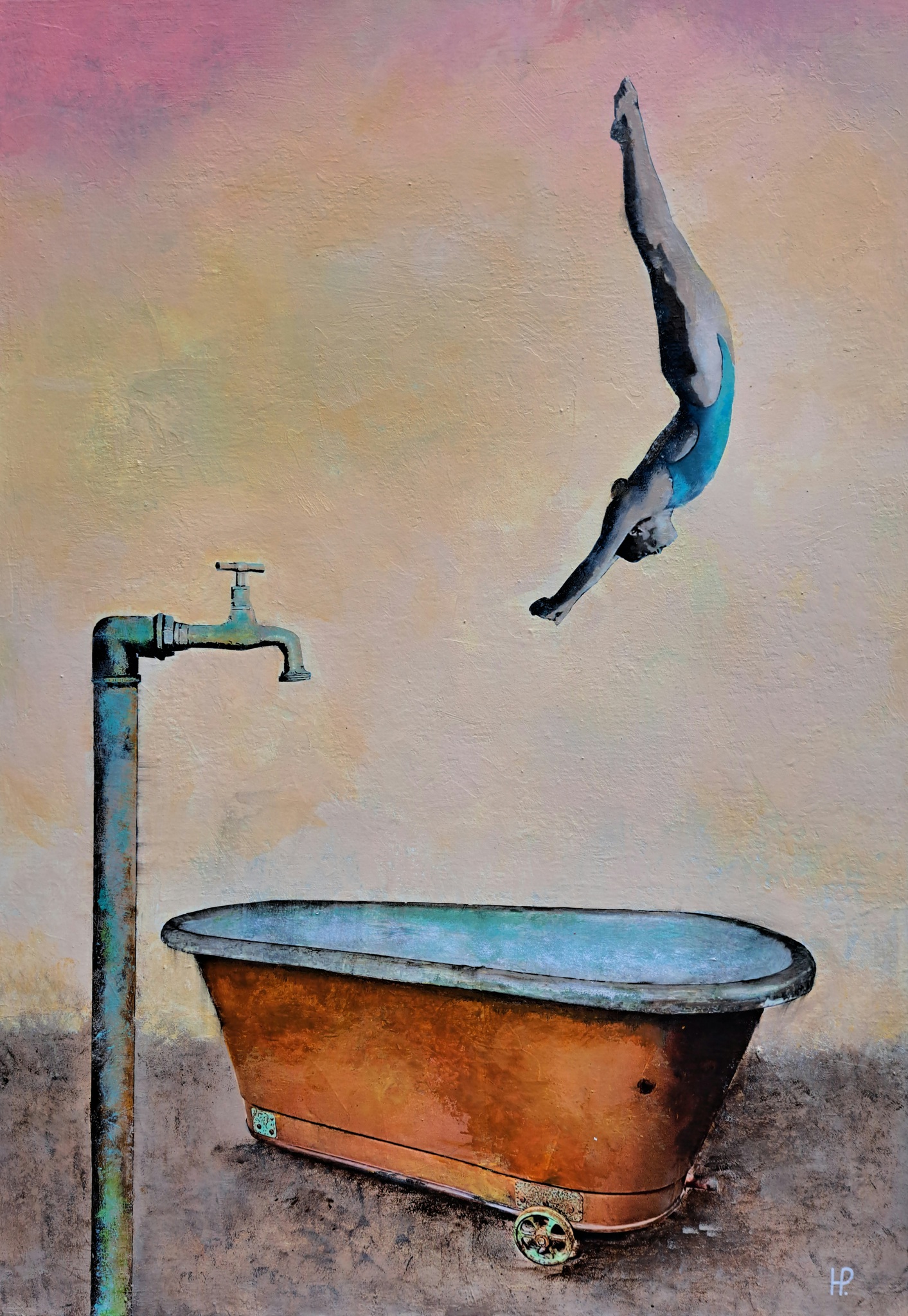 materiaal: acryl. doek opgespannen , direct op te hangen geschilderd met :acryl . onderwerp: duiken, bad, kraan, water stijl: humor, surrealistisch, romantisch, vintage afmeting: 70x100 cm.