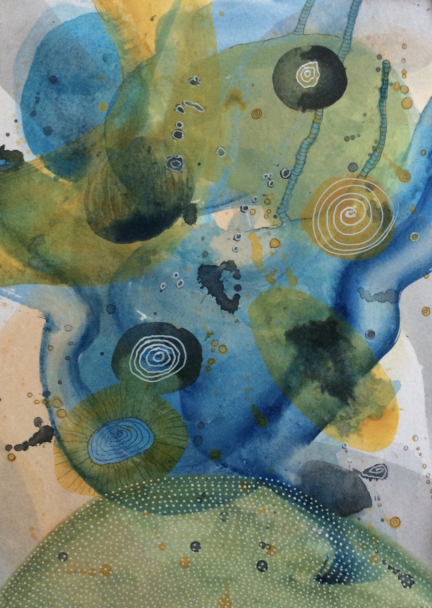 Vormen in aquarel werkend vanuit mijn fantasie en geïnspireerd door de natuur, kleuren en bewegingen om mij heen.