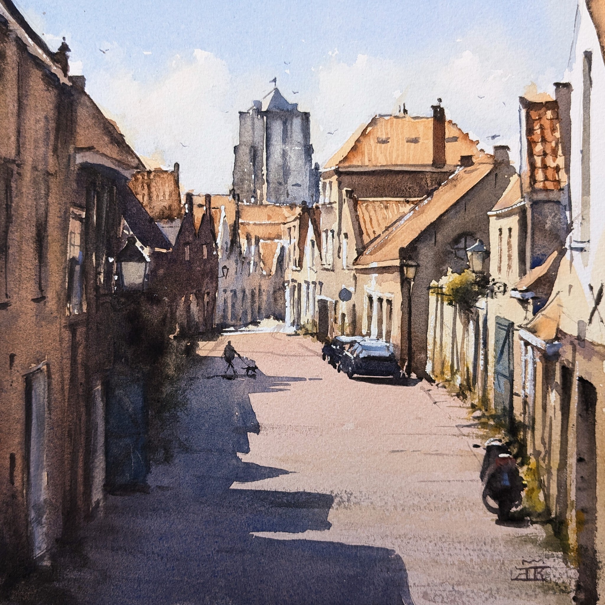 Een straatje in Zierikzee op een zomerse dag. De huizen werpen koele schaduwen in de straat met op de achtergrond de typerende stompe kerktoren. (VERKOCHT)