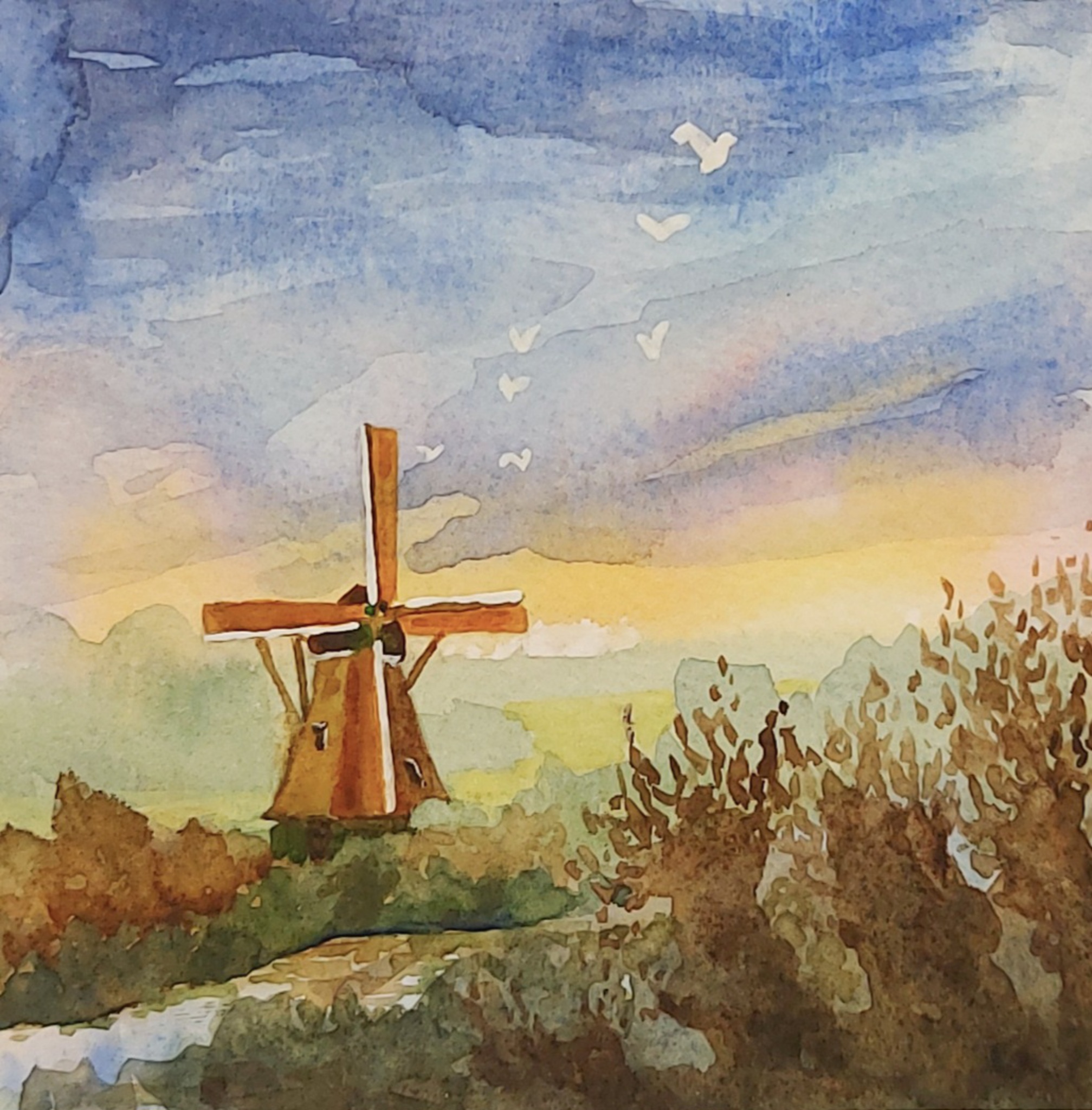 Aquarel van een geabstraheerd Hollands landschap met molen en silhouetten van knotwilgen en riet. Ingelijst in een klassiek lijstje met passe-partout. Formaat compleet met lijst: 17 x 17 cm.