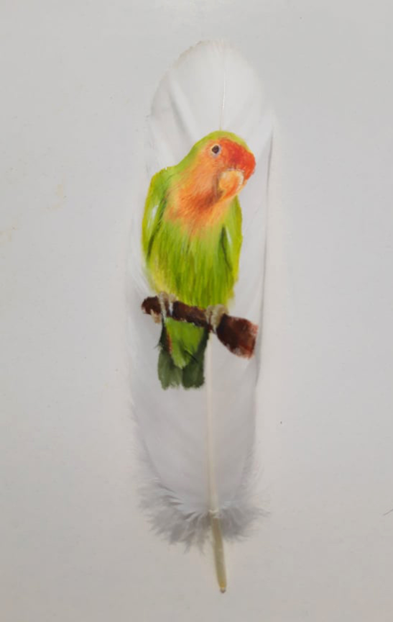 Beschilderde eenden veer , Agapornis , ingelijst in een houtkleurige lijst. Afmeting met lijst is 17x22x4cm. Prijs : €65,- Verzending met track and trace binnen Nederland € 8,25