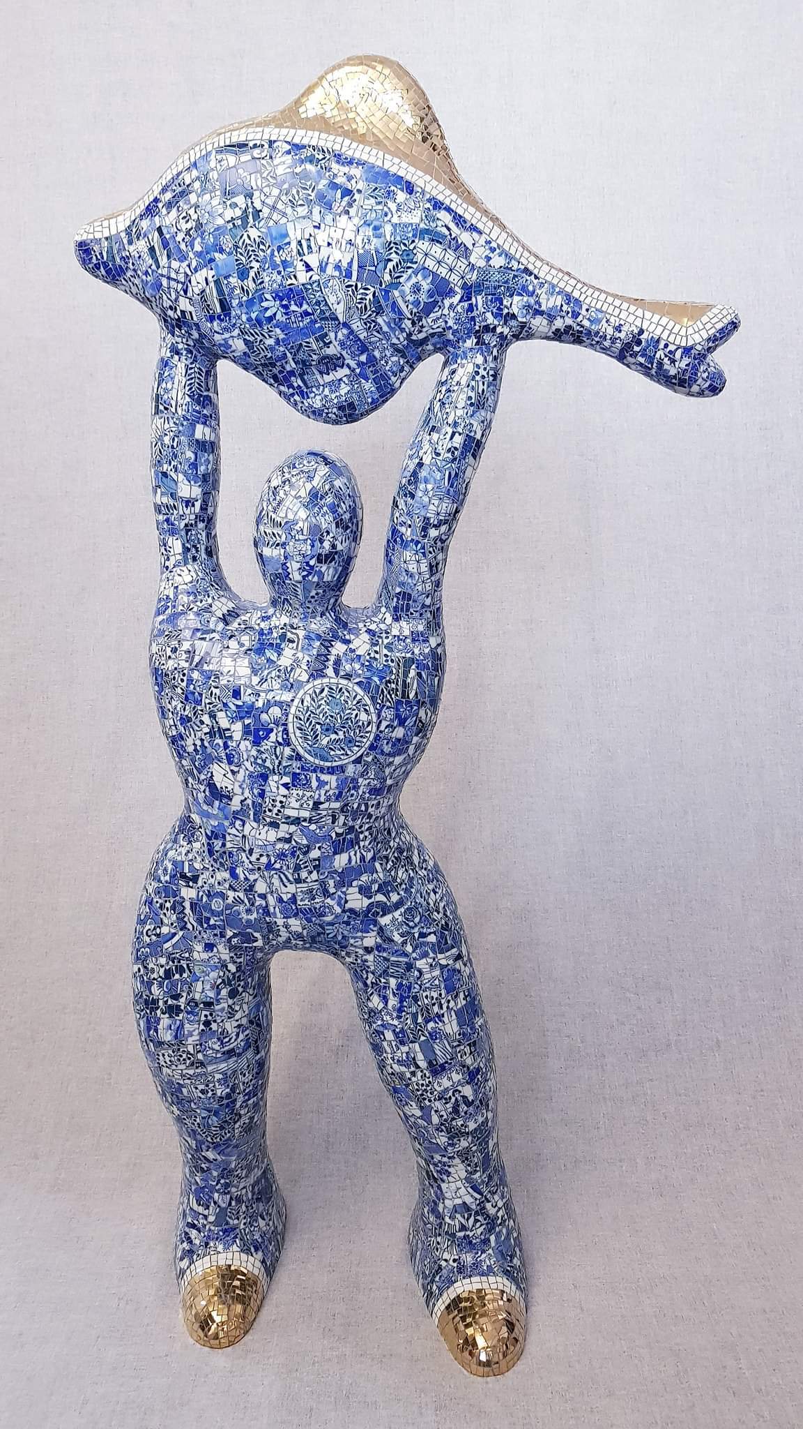 Deze blauwe porselein sculptuur is gemaakt n.a.v. een foto van mijn broer met een vis boven het hoofd. Blauw in combinatie met goud en wit porselein. Volledig met de hand gemaakt / UNICA en deze is NIET te koop.