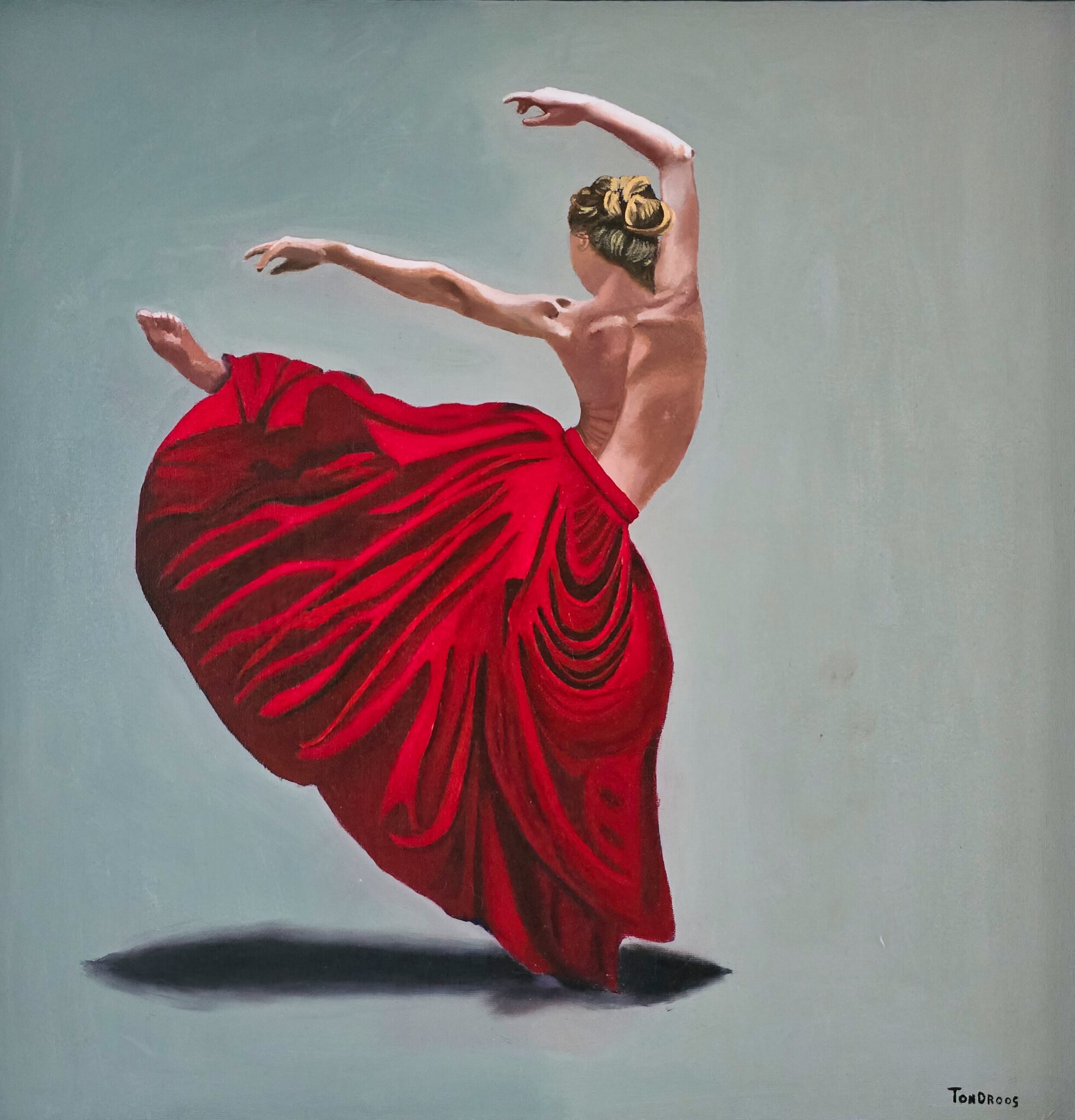 De rode kleur van de jurk met de plooien knalt van het schilderij af door een speciale schildertechniek. een sieraad aan de wand! De gracieuze pose van de danseres is een mooi object om te schilderen.