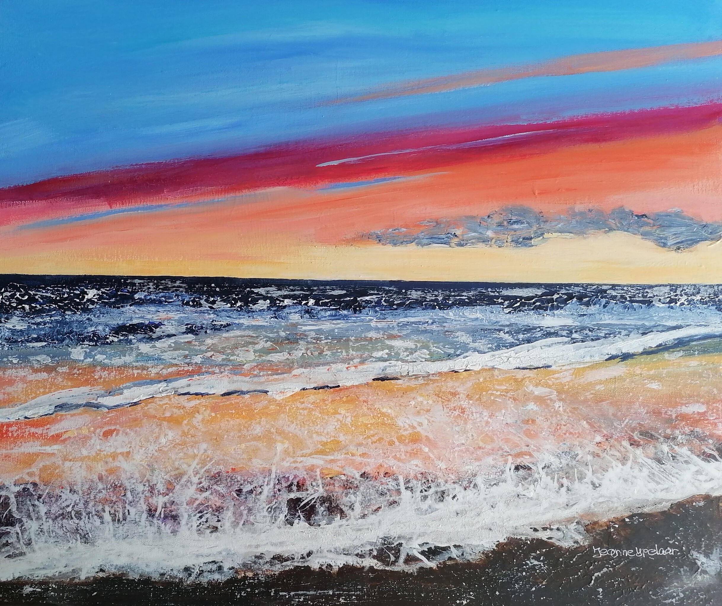 Mijn naam is Jeanne IJpelaar. Geboren in Loon op Zand. Als kind was ik altijd met potlood en verf in de weer. Jaren heb ik niets gedaan totdat ik weer in aanraking kwam met schilderen. Ik heb diverse workshops en cursussen gevolgd. Schilderen is voor mij kleur, verf, geur, nadenken en de tijd vergeten. Vaak staat er muziek op en dan lijkt het of ik in een eigen wereld vertoef waar ik heerlijk alles kan vergeten. Het liefst werk ik met aquarel en acryl verf met daarbij diverse materialen zoals zand, schelpen, papier, draad e.d. die ik dan verwerkt. Het is een uitdaging om met deze materialen een schilderij te maken waarvan ik kan zeggen dat het klopt. Schilderen is voor mij dan ook een uitlaatklep, even alles vergeten en bezig zijn met het maken van iets moois.