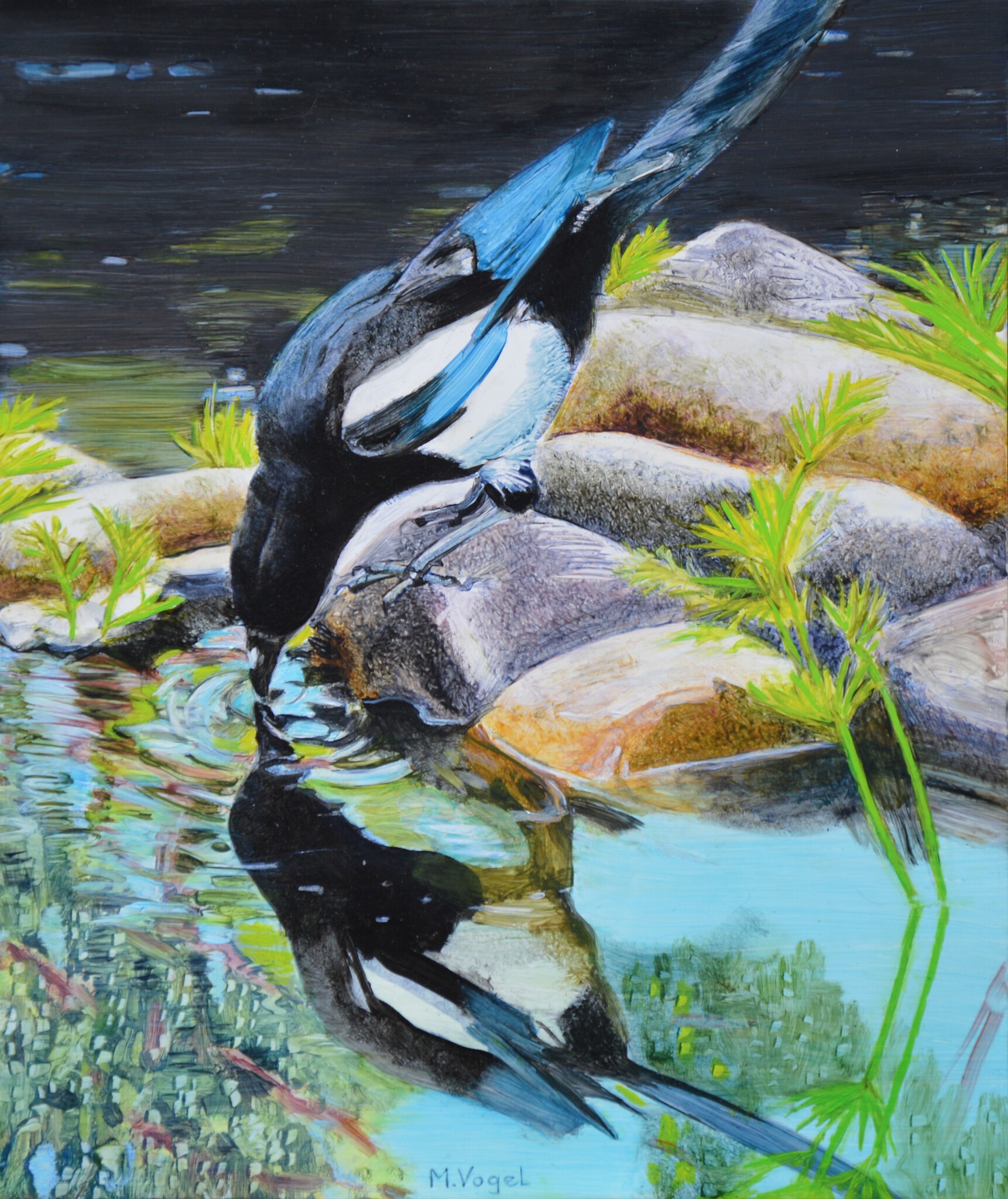 Strand Zwart Blauw Vogel Blue Water Kleurrijk Oil Olieverf Natuur Black Beach Bird Paint Stenen Bad Ekster Nature Colourful Paar Couple Bath Magpie