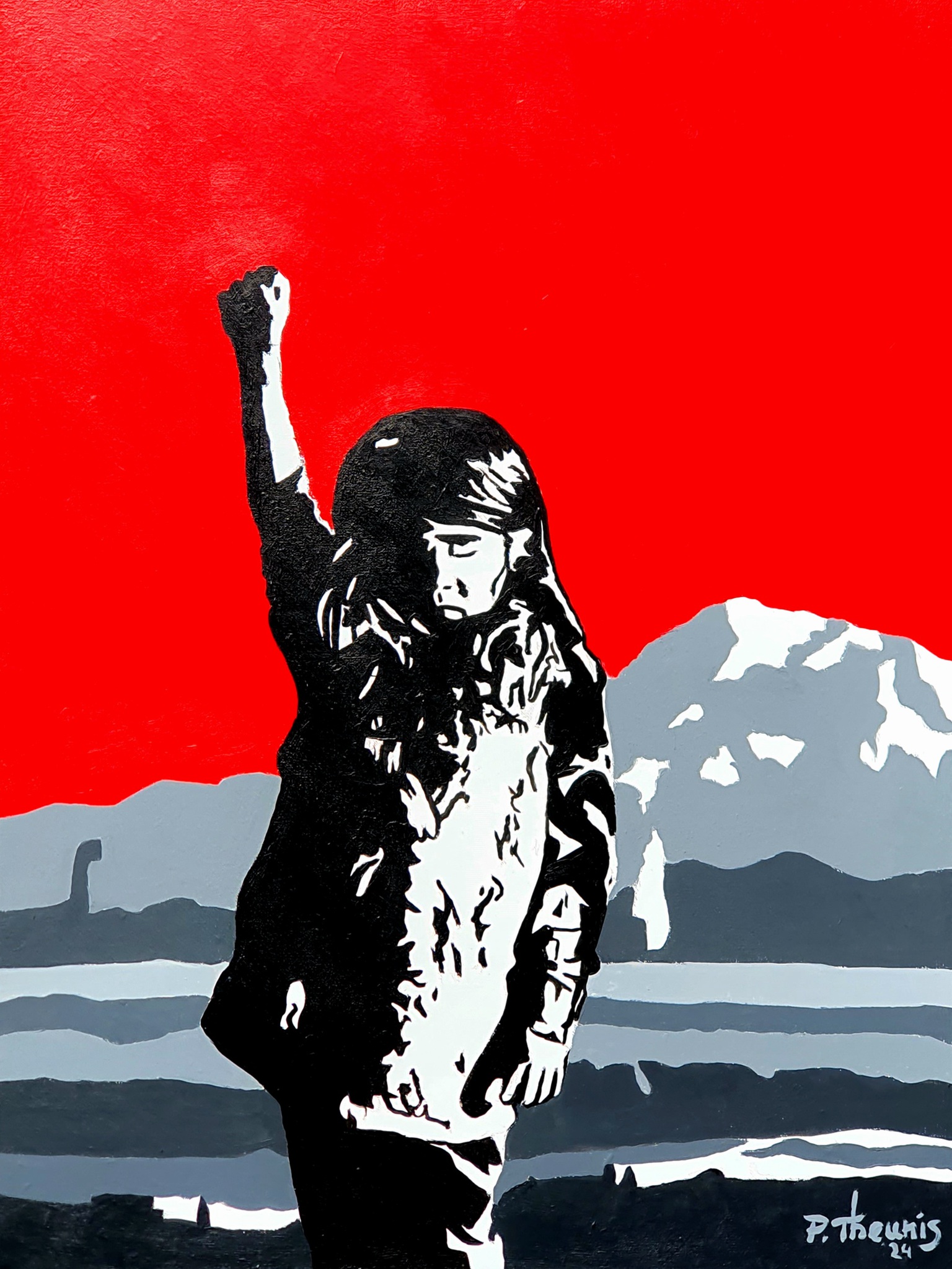 Een foto van Pinterest op een eigen Pop-Art achtige manier in acrylverf op canvas gezet. Toont het Native-protest tegen de overheid op een krachtige manier.