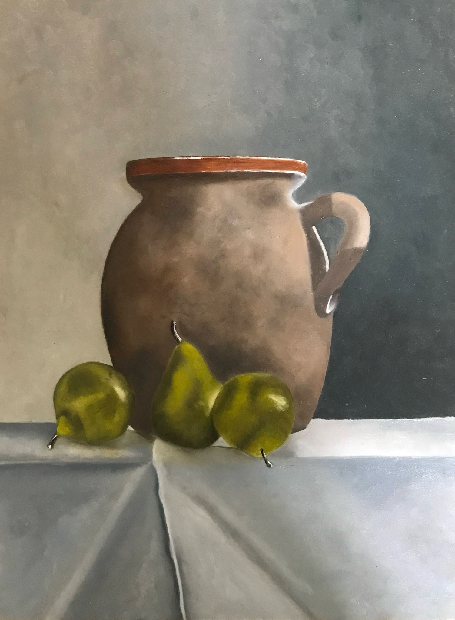 Terra Groen Bruin Olieverf Stilleven Stenen Kruik Peren Aardewerk Grijs-wit