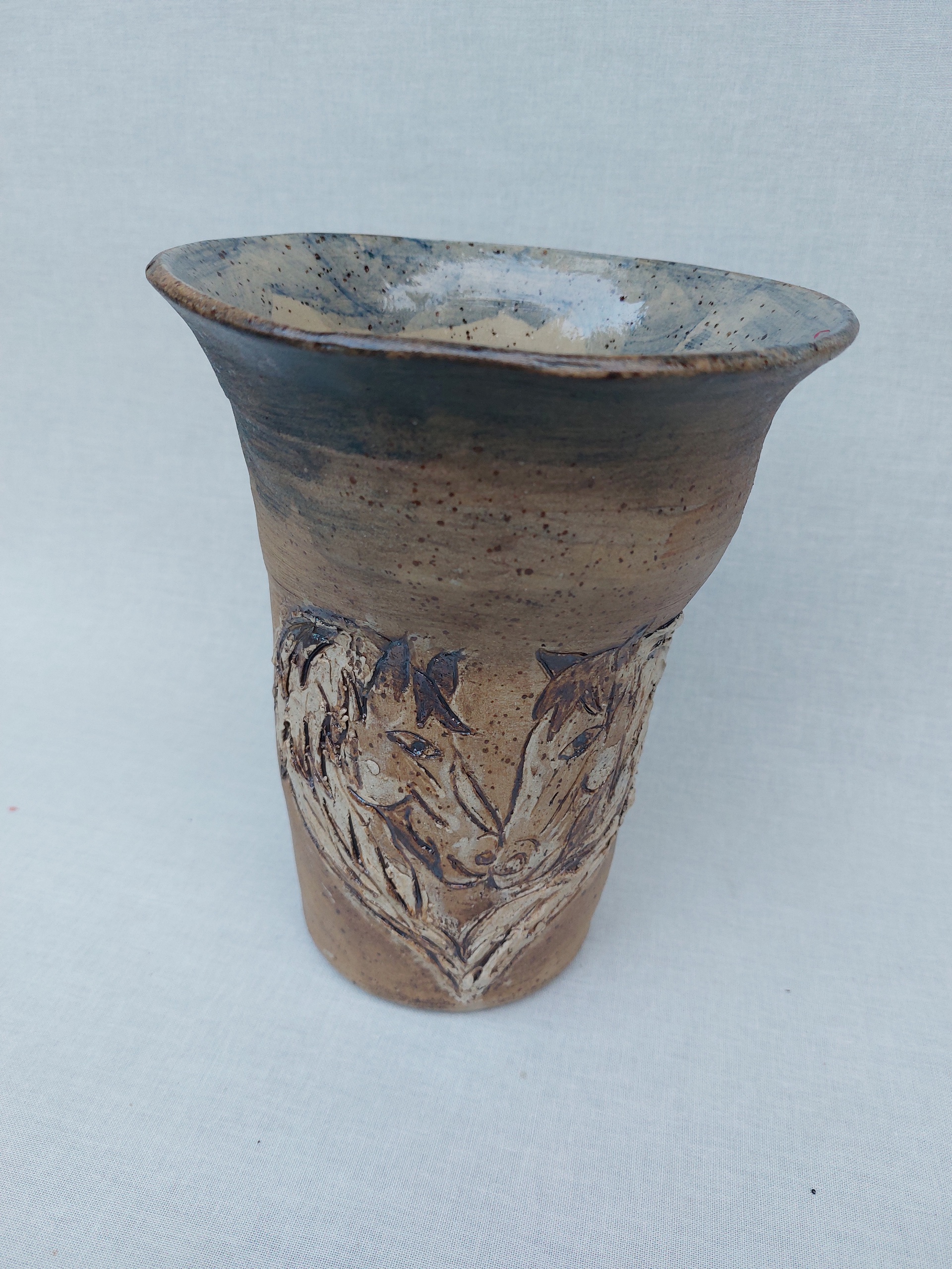 Vaas met paarden in hartvorm, gemaakt met oxides. Goed waterdicht, in verschillende tinten bruin.