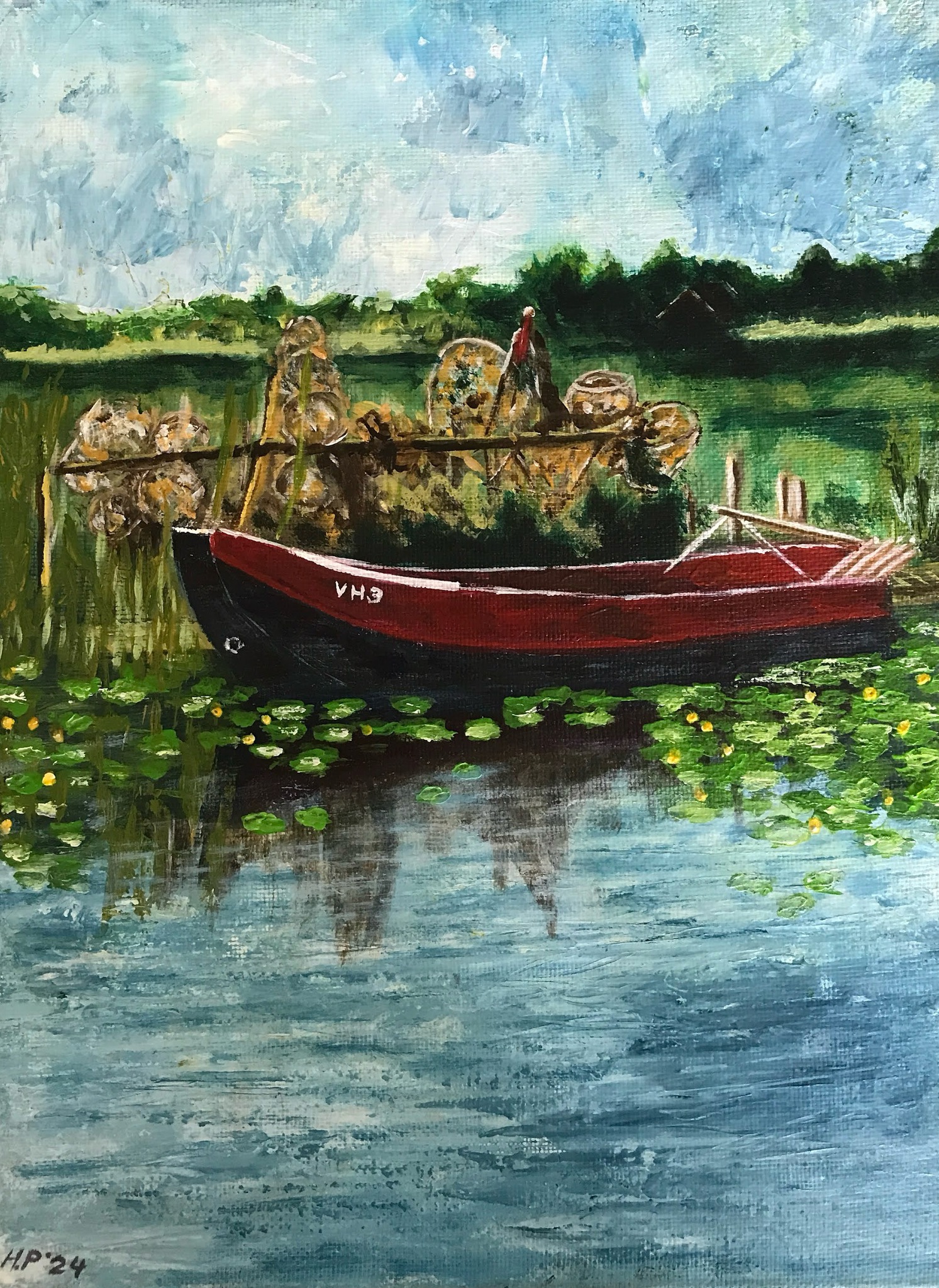 Rood Zwart Landschap Acryl Water Lucht Impressionisme Boot Sloot Vissersboot Waterplanten Roeiboot Gele Visnetten Fuiken Plomp