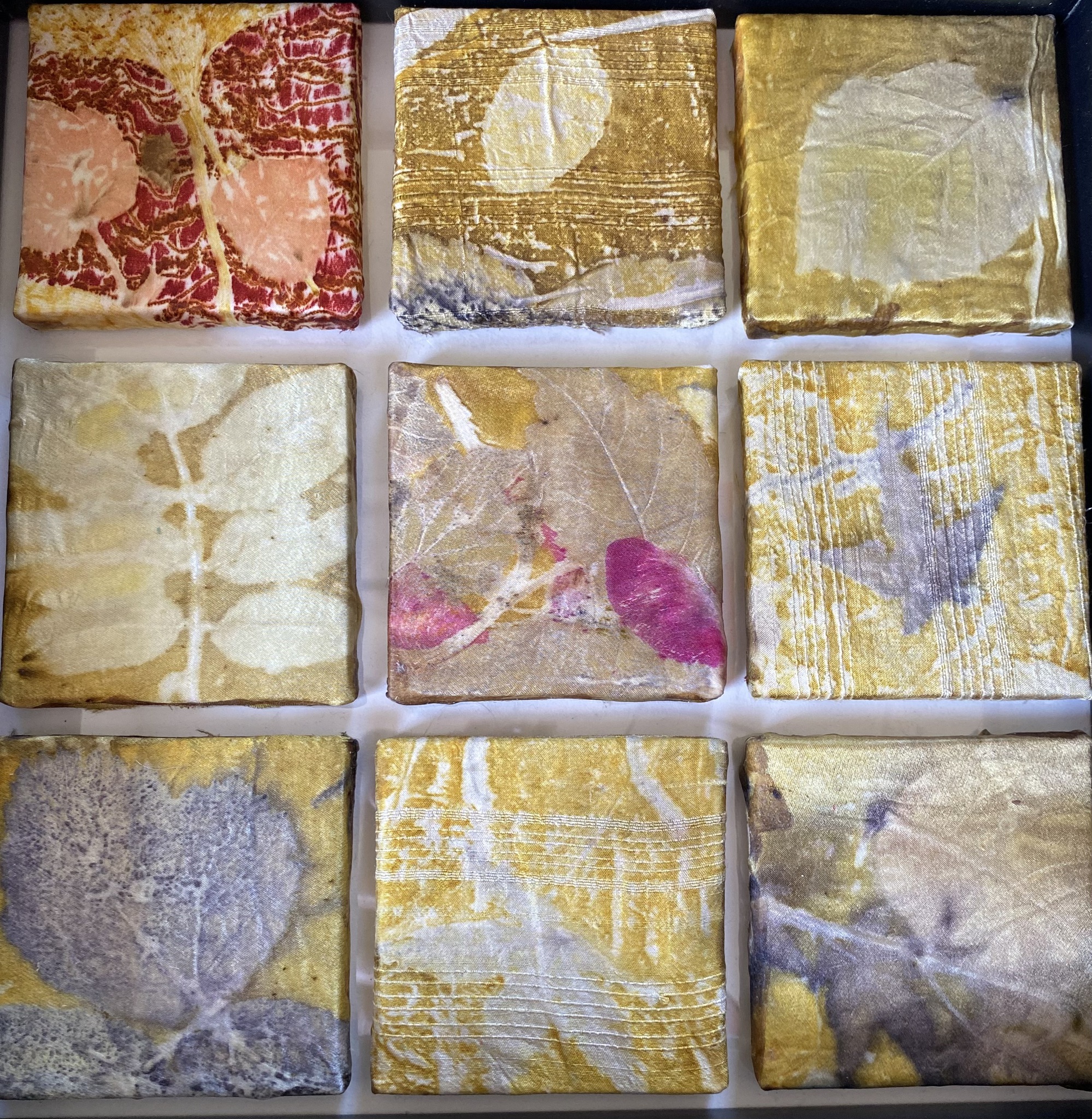Kleine schilderijtjes van zijde, verzameld in een baklijst. Je kunt op elk schilderijtje wel zien welk blad er op gedrukt is. Ze zijn uniek.