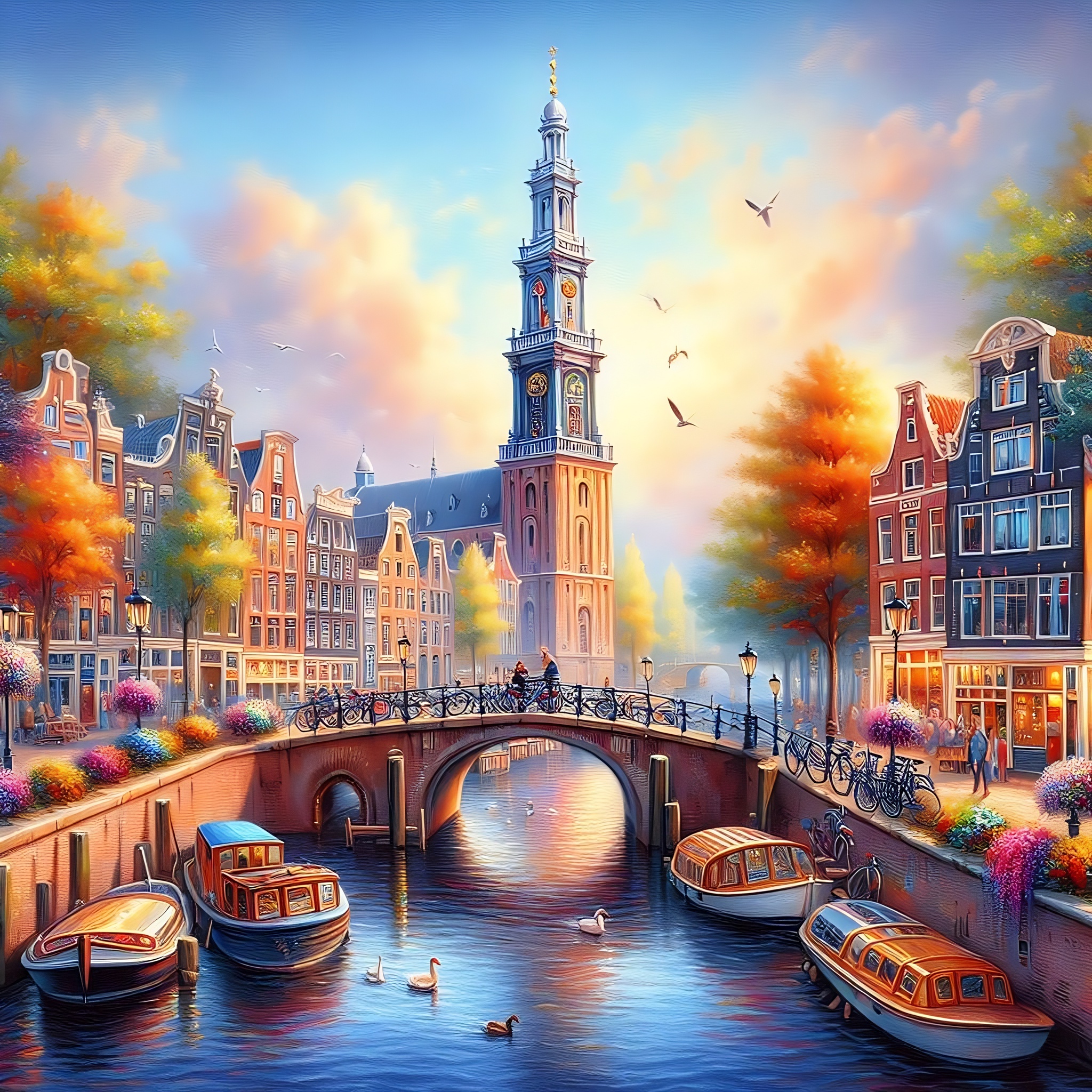 Digitaal Canvas Amsterdam Stadsgezicht Kleurrijk Digitale Linnen Afbeelding Surreëel Impressionistisch Ai