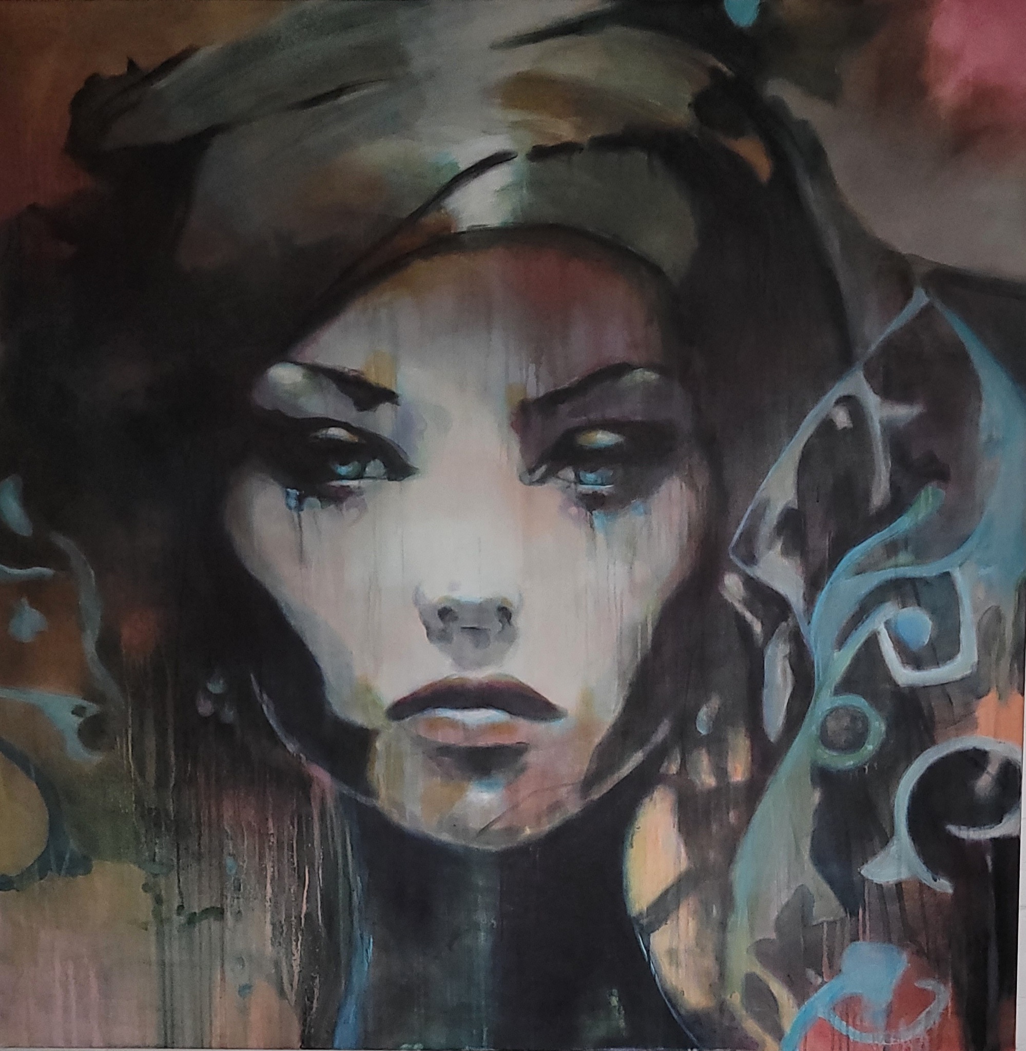 Krachtige uitstraling met als onderschildering/eerste laag het meisje met de parel. Sfeervol groot schilderij. moderne portretkunst, een combinatie in de stijl van popart en figuratieve kunst. De sterke contrasten, het gebruik van kleurvlakken, en de focus op een grafisch en expressief portret , die ook in de popart worden gebruikt, terwijl het figuratieve aspect zich richt op de herkenbare weergave van het gezicht in combinatie met mijn eigen schriftuur .