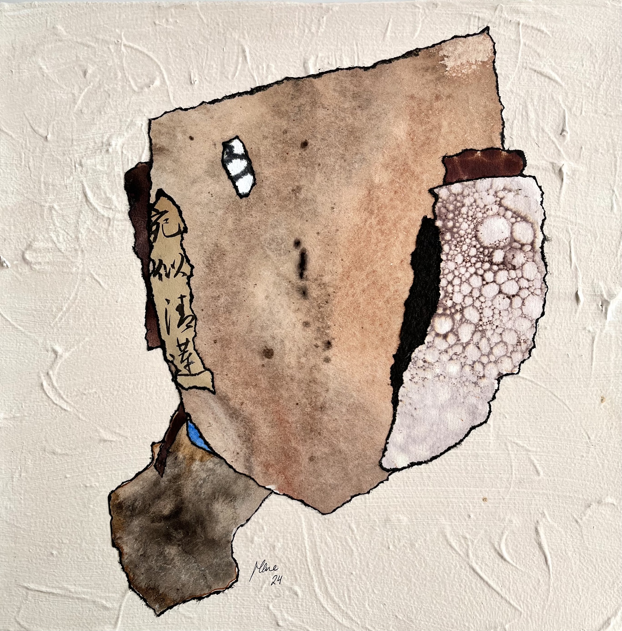 Face 8 in the series 'All our Faces'. Collage of handpainted paper, ink, acrylic paint, and Japanese text.