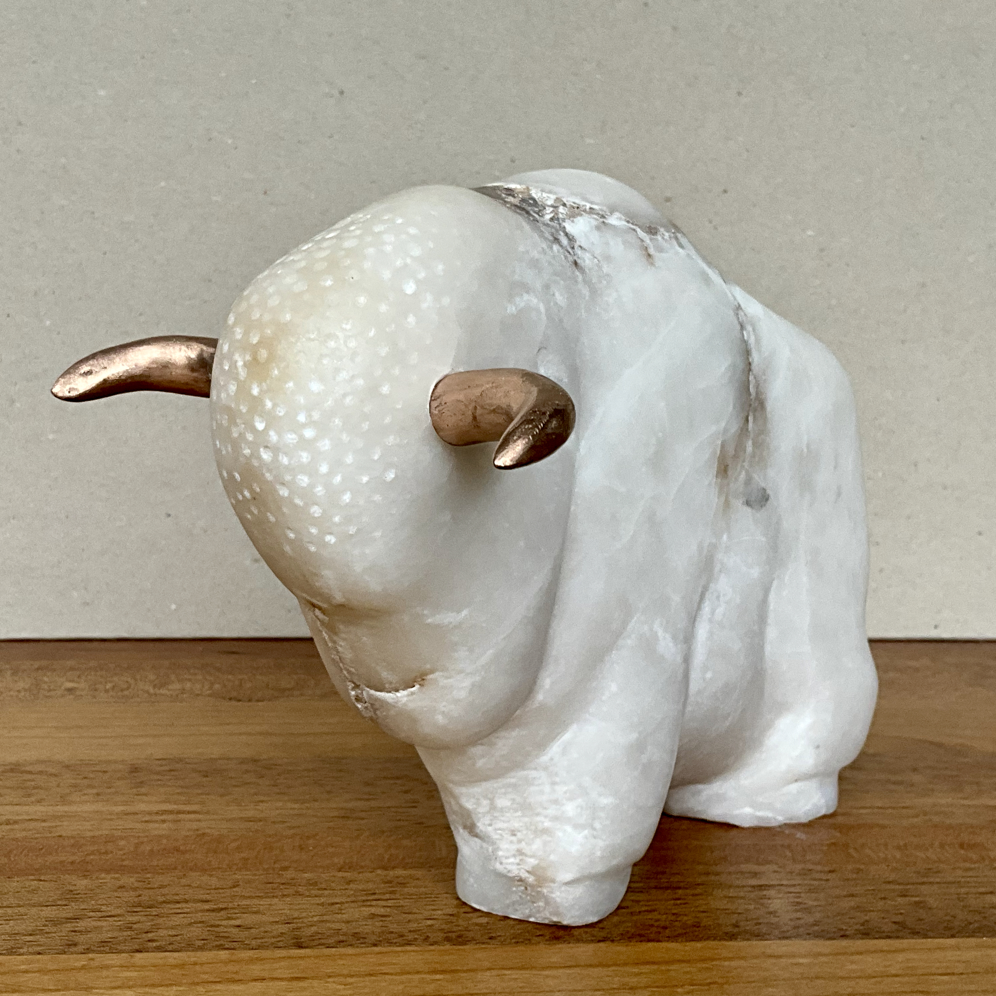 Kleine stier uit albast met bronzen horens.