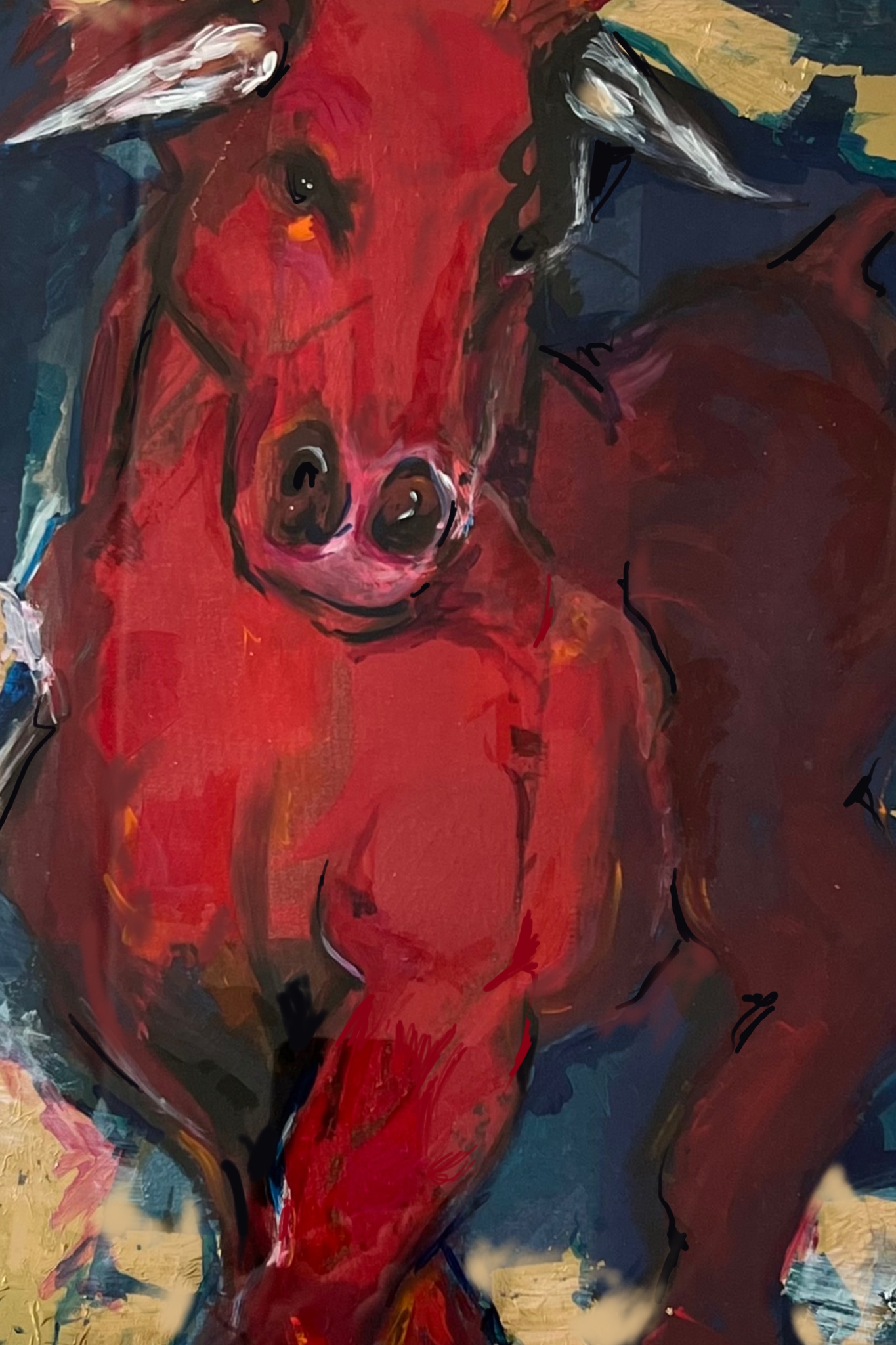 Mixed media, unica. In lijst 52x42 cm met passepartout Een krachtige rode stier Digitaal vervaardigd - fine art print - na afdruk beschilderd. Zo ontstaat een uniek kunstwerk.