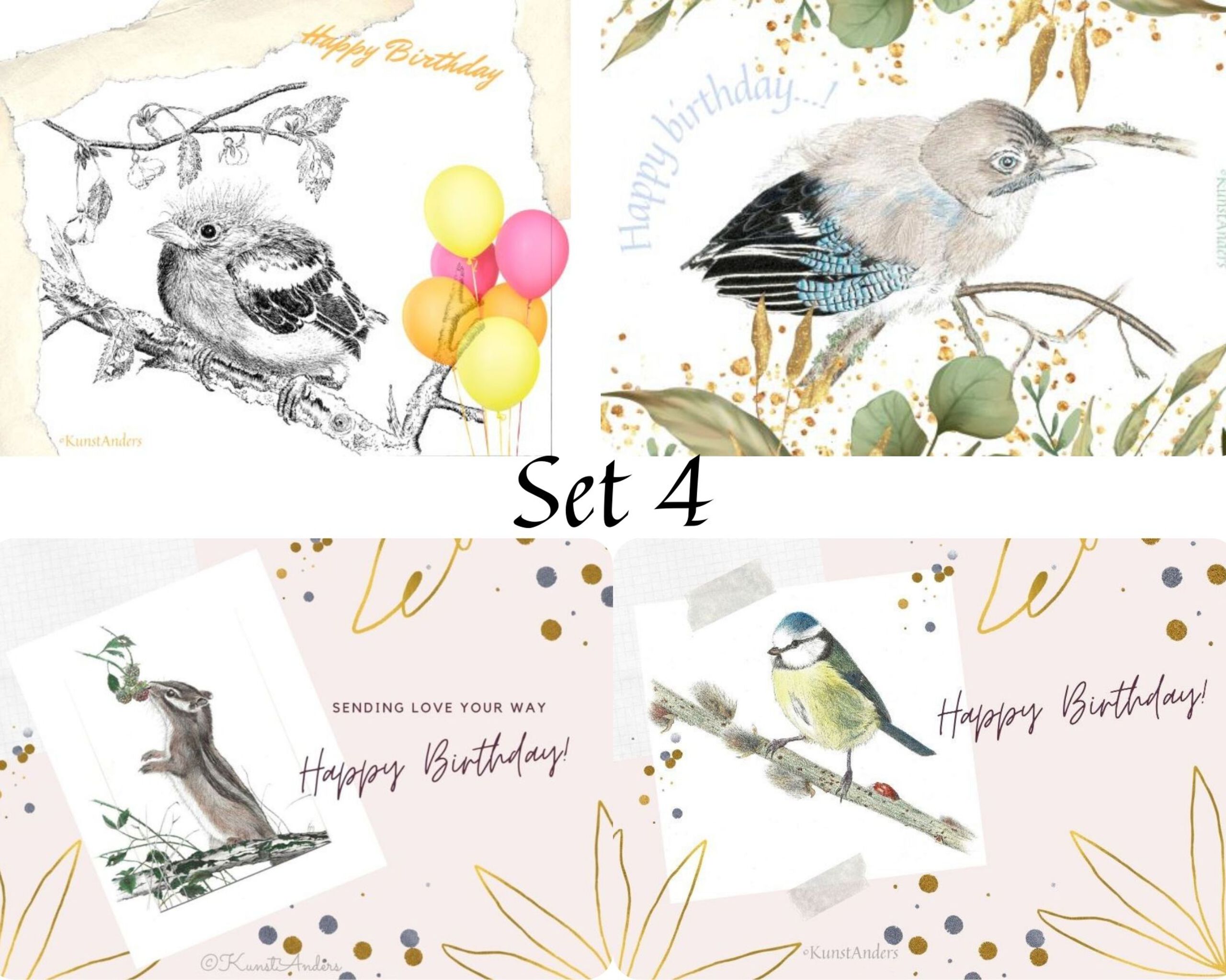 Set van 4 dubbele themakaarten (verjaardag), incl. luxe enveloppe, van pentekeningen van een jonge vink, een jonge gaai, een pimpeltje en een grondeekhoorn.