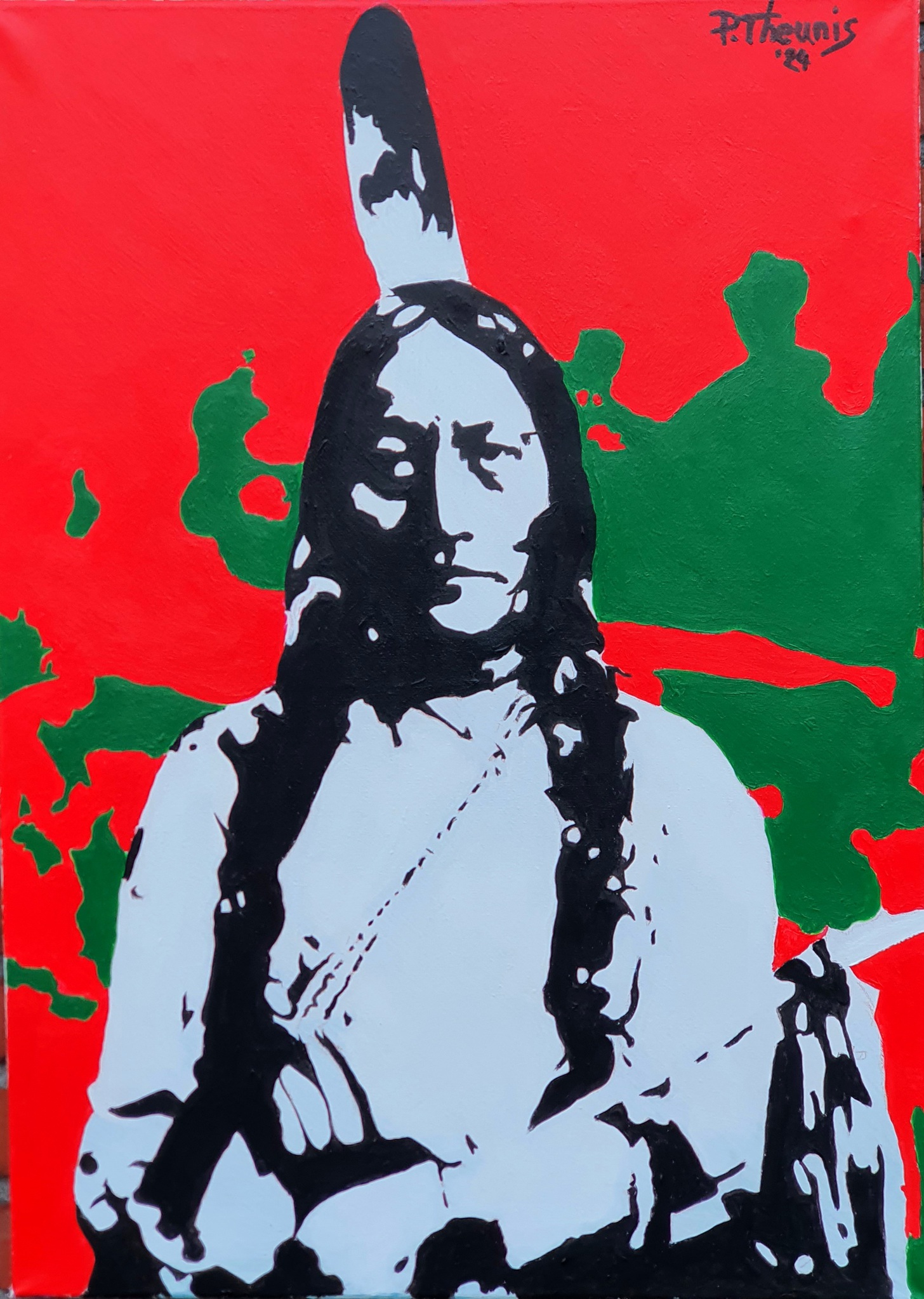 De legendarische Sitting Bull op een Pop-Art-achtige manier uitgevoerd in acrylverf.