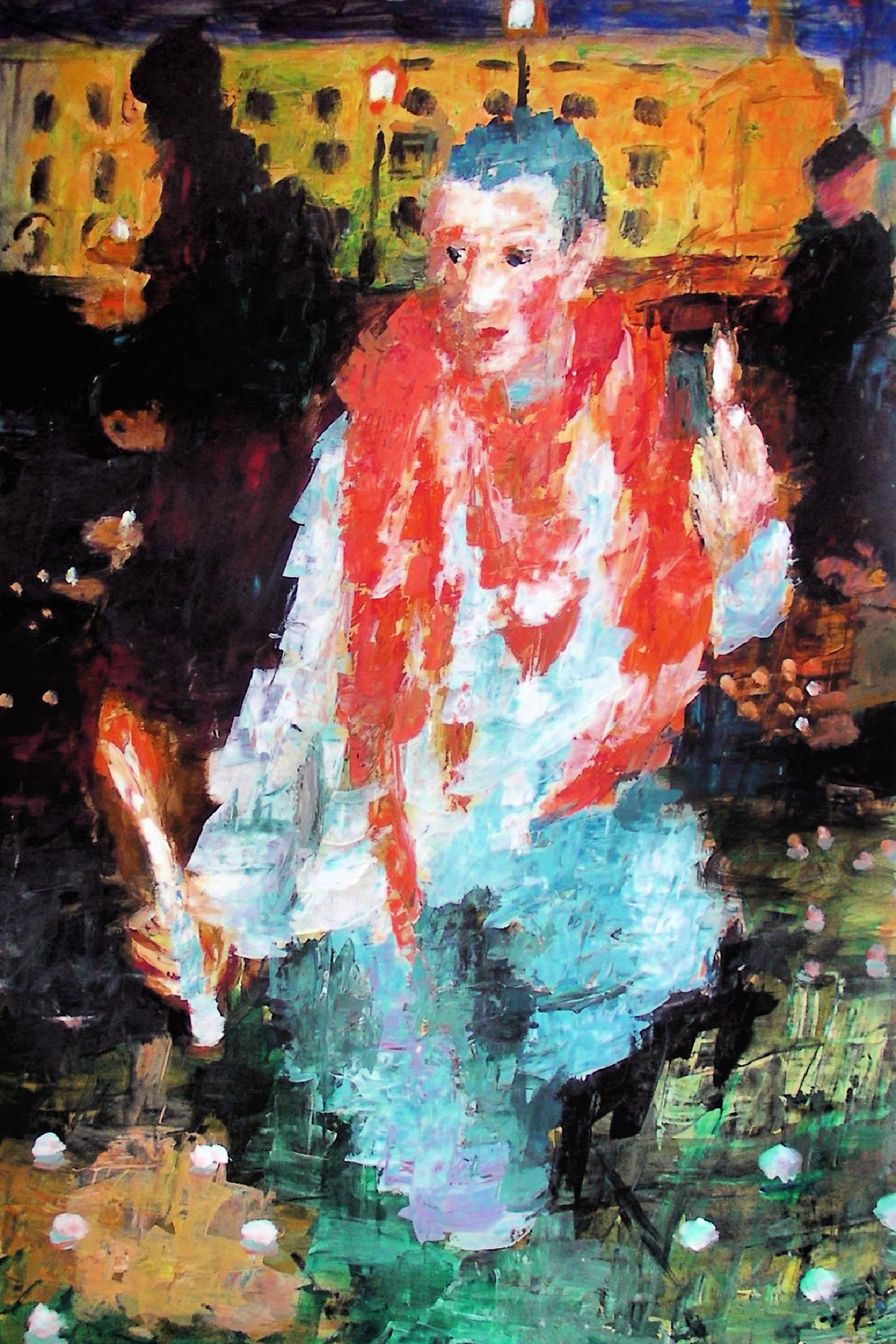 Deze vrouw knielt, houdt haar dubbellicht omhoog. Donkere schaduwen bewegen op de achtergrond. Zij is als een baken in de duisternis.