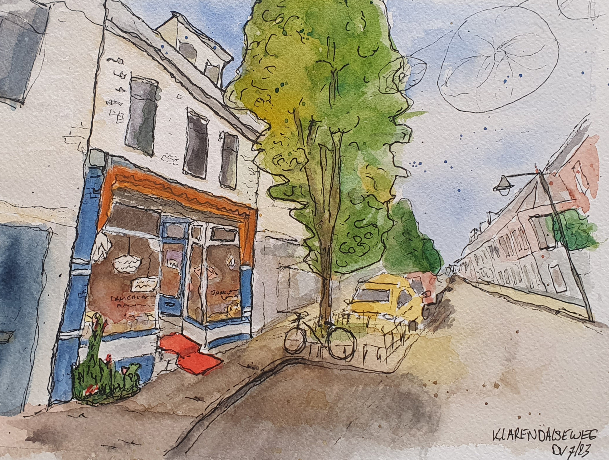 Mijn allerleerste urban schets. Van mijn eigen atelier-winkel aan de Klarendalseweg in Arnhem. Een heerlijke plek om te werken.