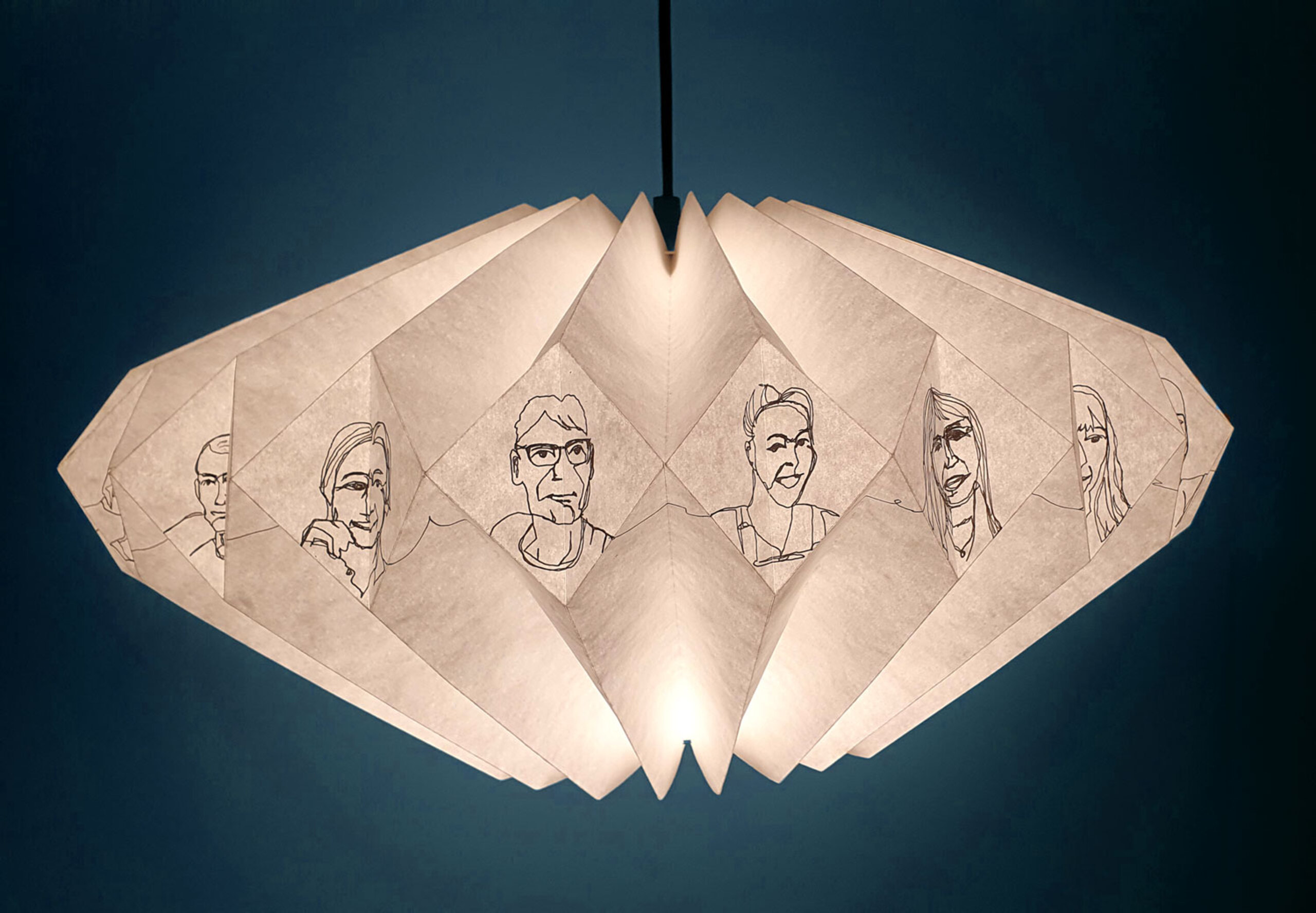 Origami lamp Lydia, voorzien van 24 portretjes getekend in één lange lijn.