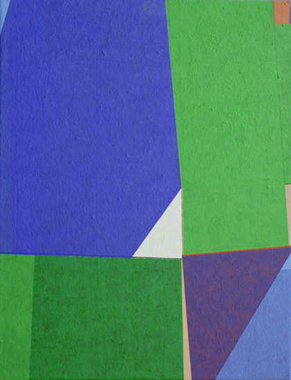 Geometrisch abstracte compositie in een eenvoudige vormtaal van heldere monochrome kleurvlakken. Verbeelding van een abstracte innerlijke werkelijkheid.