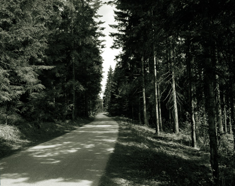 zwartwitfoto: Een verlaten weg baant zich licht buigend een weg door het naaldbos.