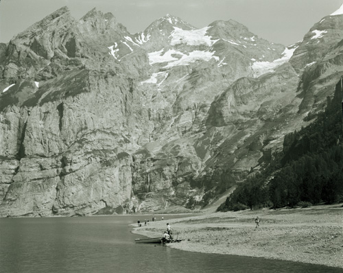 zwartwitfoto: Bergmeer onder een majestueus gebergte.