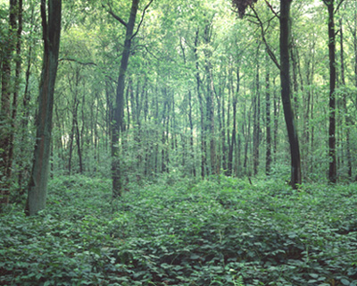 kleurenfoto: Frisgroen voorjaarsbos in avondschemerlicht.
