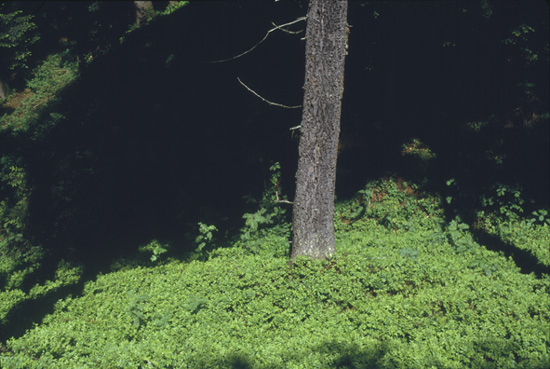kleinbeeld kleurenfoto: Een helder verlichtte dennenstam in een bed van frisgroen bosbessenloof tegen een donkere schaduwrijke achtergrond.