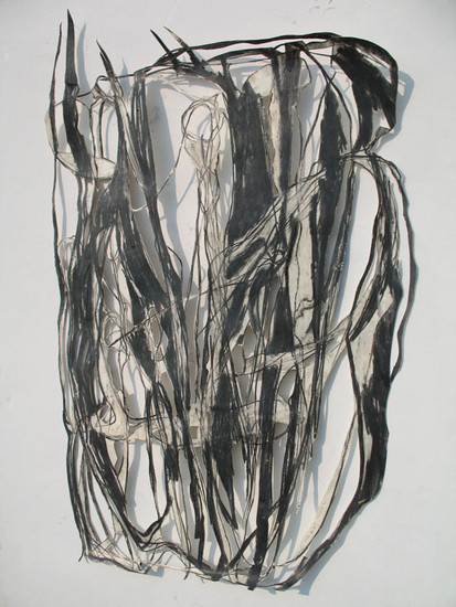 Carien Engelhard (1949)drukt zich uit in tekeningen en sculpturen en op het grensvlak tussen deze twee. Momenteel maakt zij papiersnedes: dat zijn tekeningen waar ruimten in gesneden zijn en die op een afstandje van de muur hangen zodat het licht door de tekening heen op de achterwand schaduwen kan vormen. Geïnspireerd op vormen uit de natuur als verdroogde bladeren, wortels of stenen maakt zij van verschillende materialen vormen die -aan de wand hangend -de ruimte in komen.