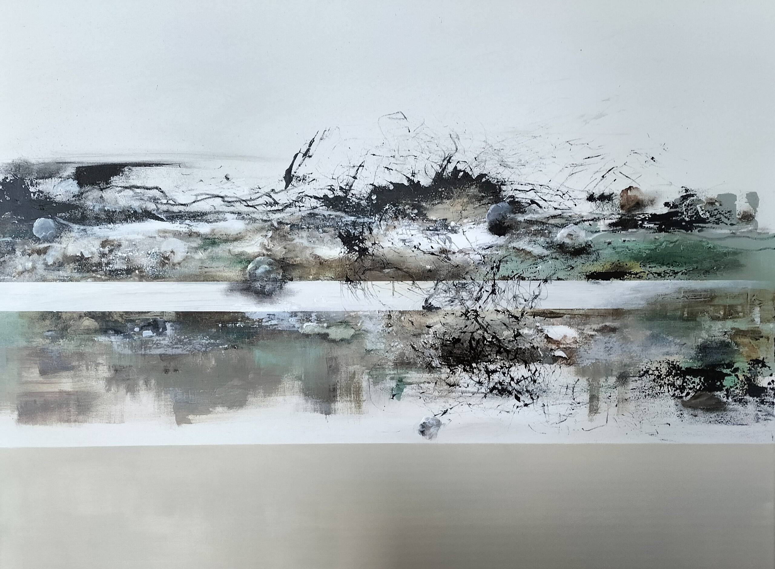 Mixed Media. Acryl als basis met inkt, bister, vetkrijt. Professional Cotton 120 x 90 cm. Leverbaar met of zonder metalen gelaste lijst.