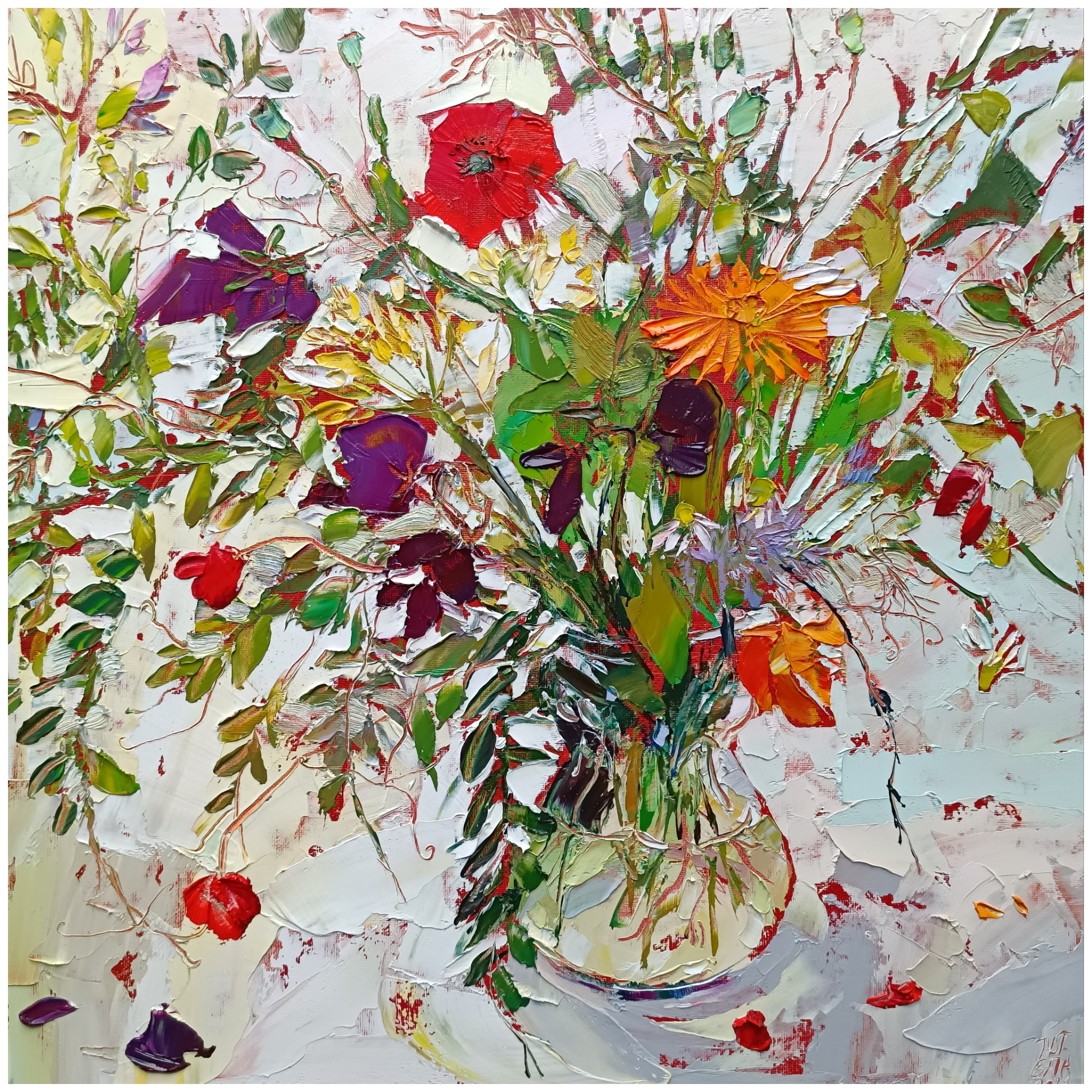 Schilderij Rood Pot Bloemen Glas Wilde Blue Kleurrijk Vierkant Red Green White Flowers Witte Paletmes Pink Grote Wild Achtergrond Glazen Papavers Colourfull Goudsbloem Background Impasto