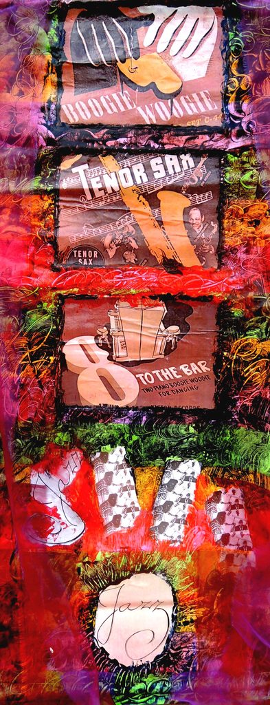 Vaandel van ritme en beweging in de Jazz muziek. Ze hangen 3 maanden buiten in historisch Souillac Frankrijk. Dialogue entre les couleurs instrumentals du jazz et le rythme . Le Swing dans les bannières.