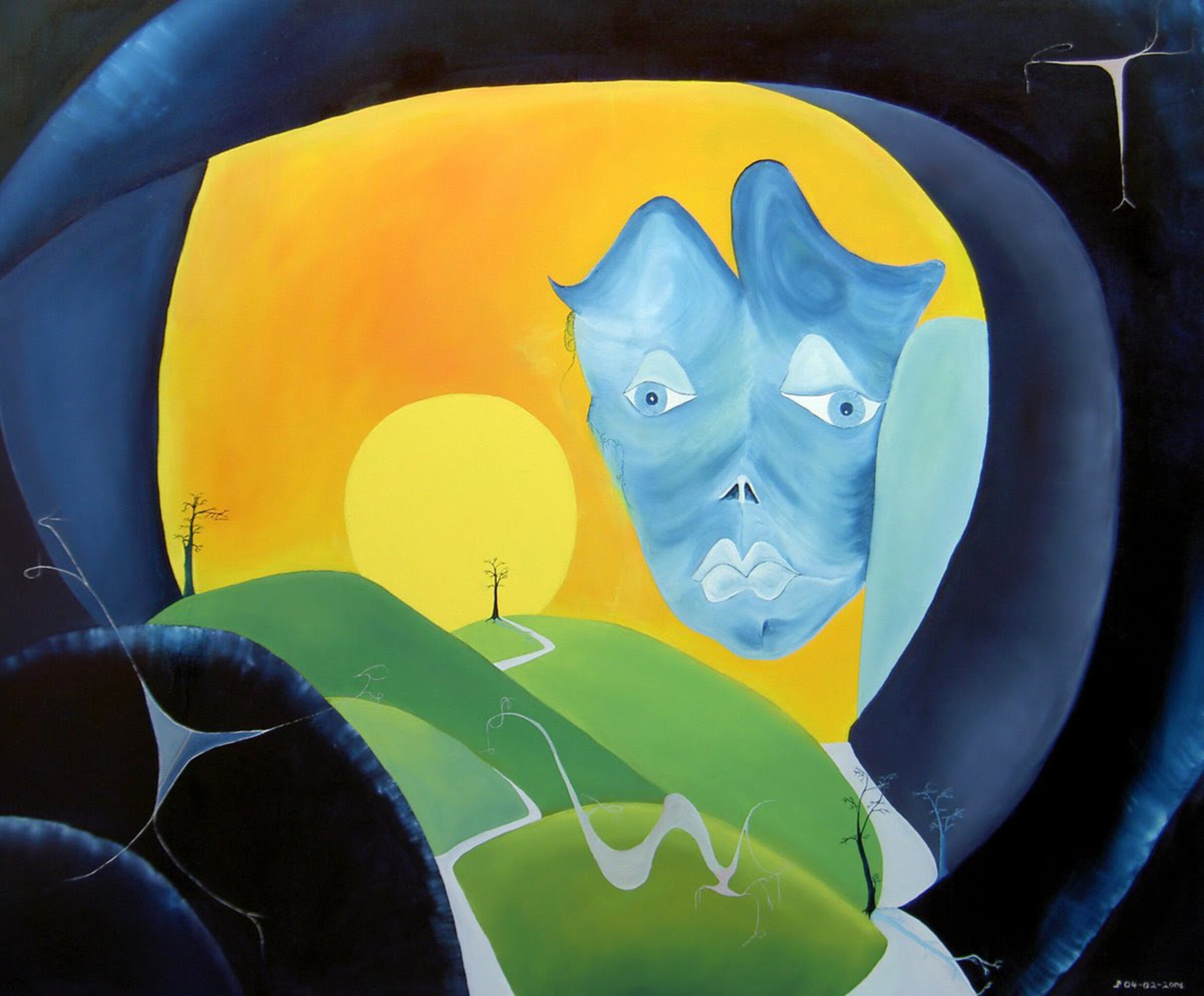 Jozef penseelt in rijkgeschakeerde tinten. De magiër aanschouwt de realiteit met kinderogen. Het werkt betoverend voor wie dat durft toe te laten. Kijken is dan ook de boodschap.