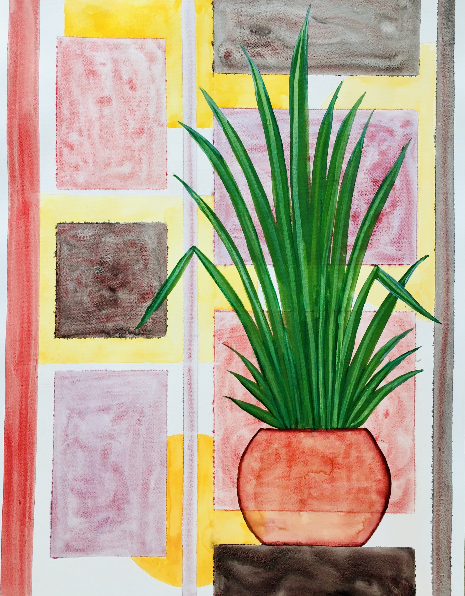Aquarelschilderij, 2024 Deze levendige aquarelillustratie toont een kamerplant met lange, smalle groene bladeren in een terracottakleurige pot. De plant staat centraal tegen een achtergrond vol kleurrijke geometrische vormen in tinten zoals roze, geel, bruin en grijs. Het contrast tussen de strakke, rechthoekige vlakken en de organische vorm van de plant creëert een spannend en modern geheel. De transparante penseelstreken en kleurlaagjes geven de compositie diepte en levendigheid.