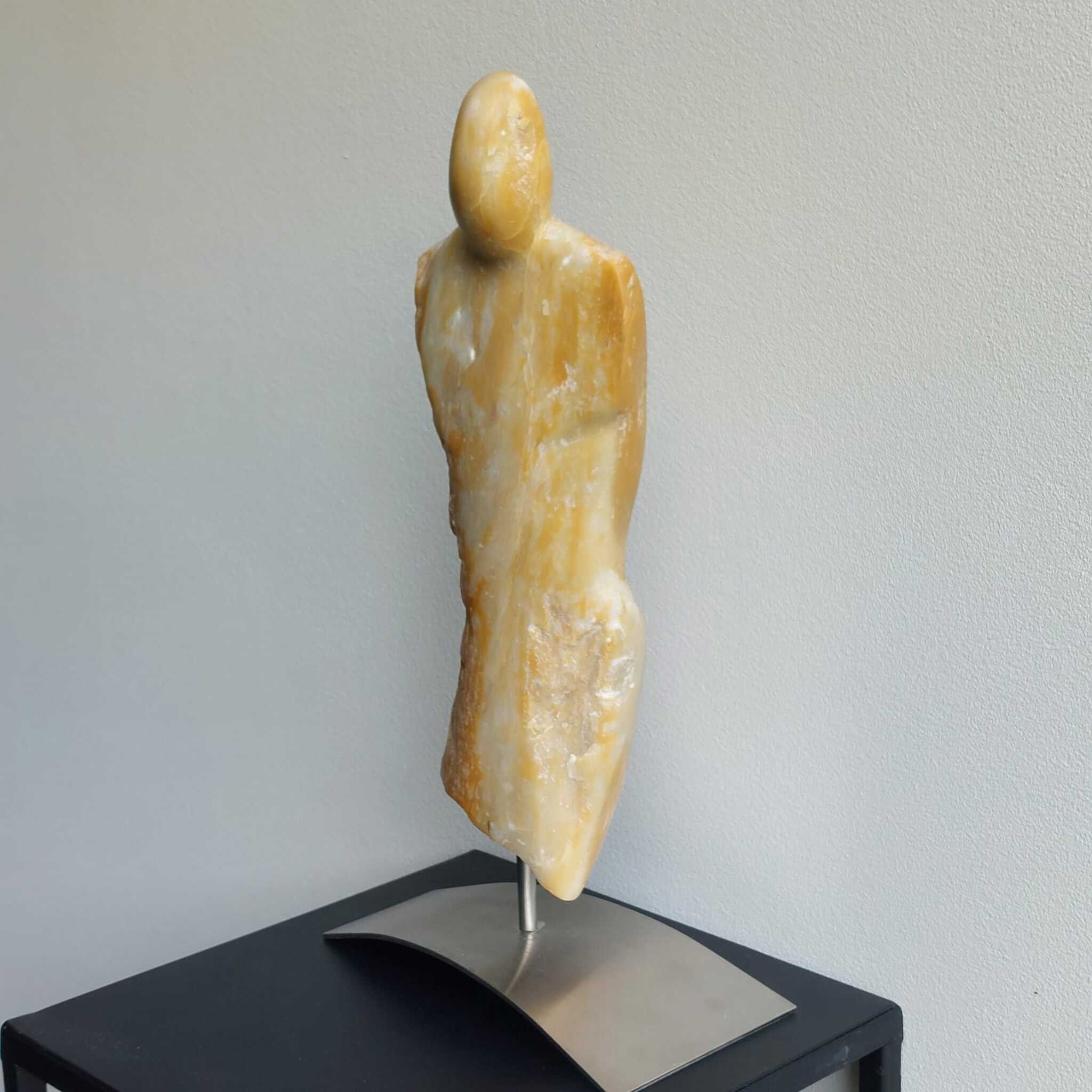 Een robuust werk in giallo sienna marmer. Prachtige gele kleurschakering. Op een statief van roestvrijstaal.
