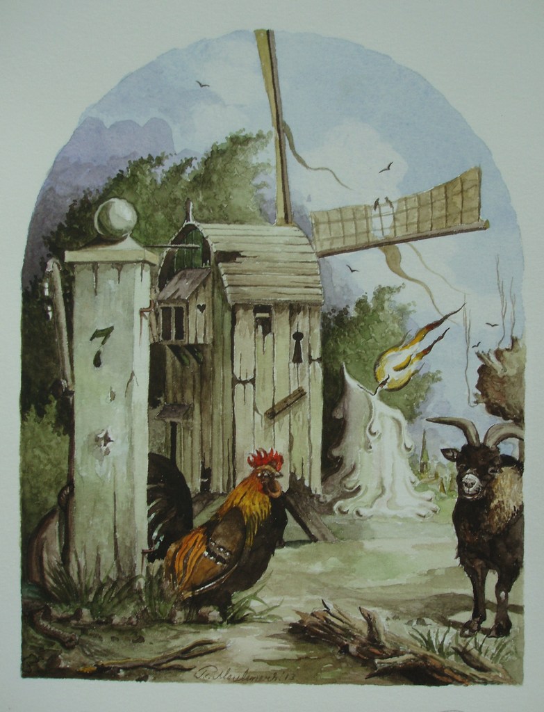 Landschap Papier Aquarel Romantisch Realisme Lente Haan Geit Molen Kaars Fantastisch Sleutelgat