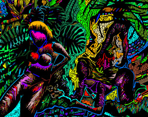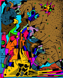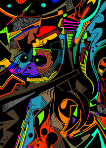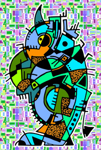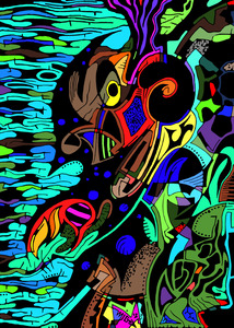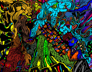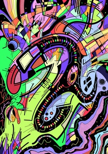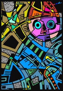 Maurice tekent op papier met pen en inkt en op iPad. Het drukke lijnenspel met opmerkelijke kleurcombinaties van patronen en figuratieve elementen biedt een ontsnapping aan de dagelijkse sleur.