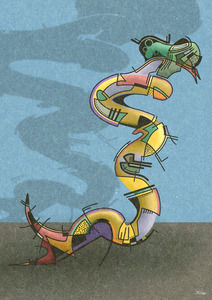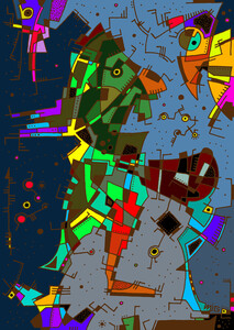 Een abstracte kakofonie van gekleurde stromingen, eilandjes en dijken.