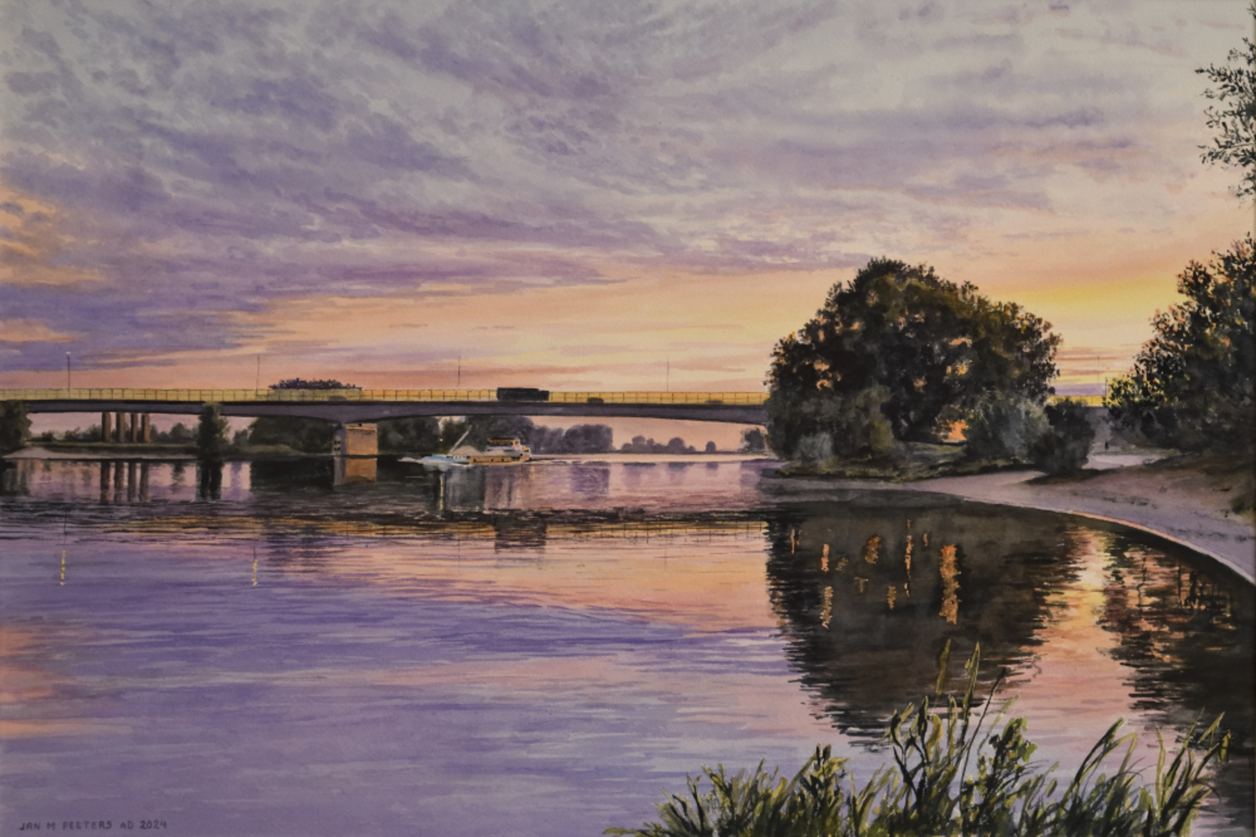 Wat een feest van kleur als de zon achter het talud van de Maasbrug tevoorschijn komt.