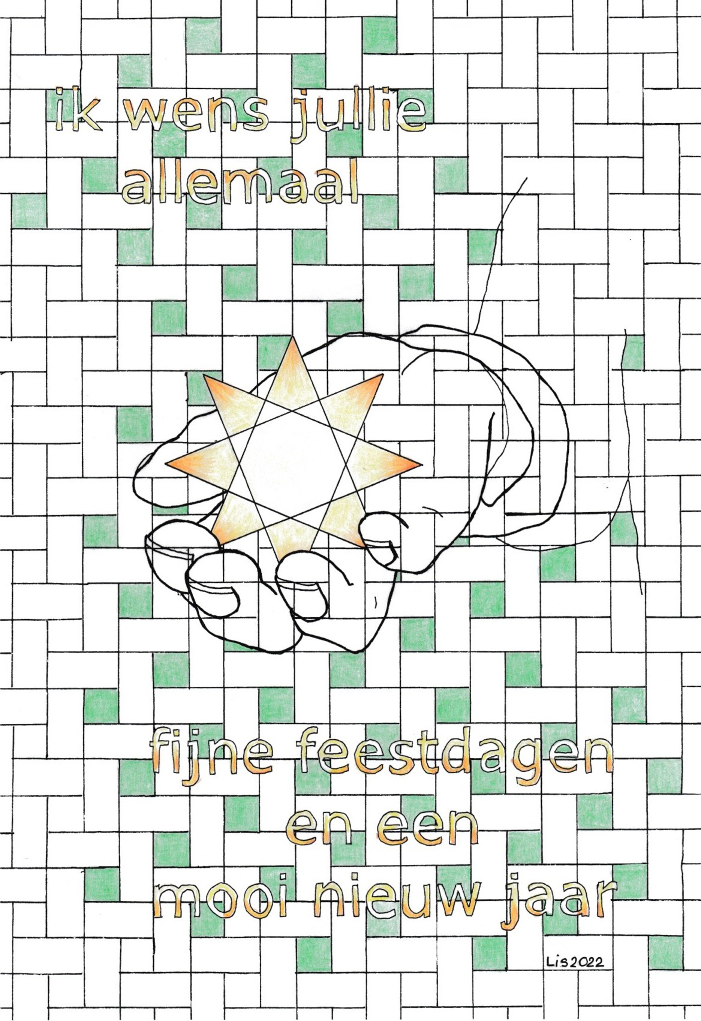 Kerstkaart met een afbeelding van een kerstster als geschenk, vergezeld van een gelukswens.