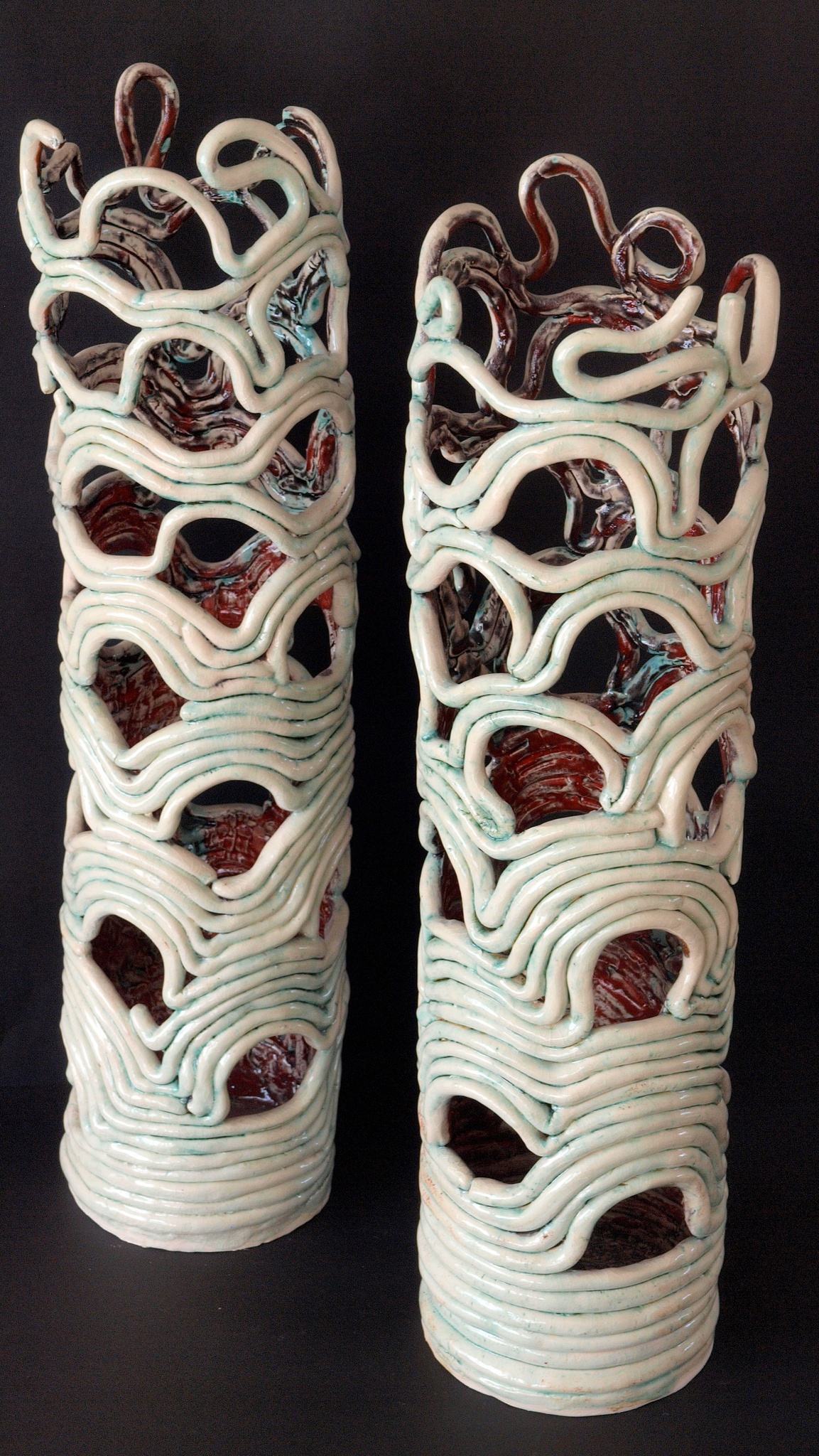 Opgebouwd uit hand gerolde strengen klei met open ruimtes. De buitenkant gekleurd met oxide en transparant glazuur, binnenkant met een rood effectglazuur. Aardewerk.