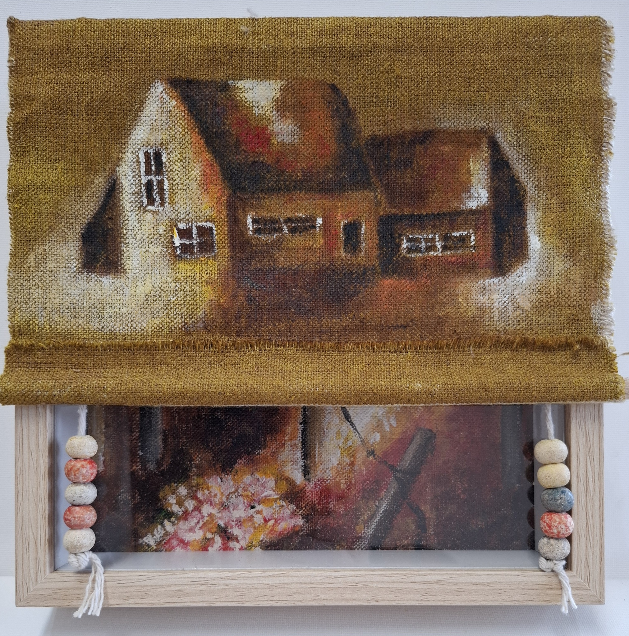 3D kijkkastje met huisje in acryl en linnen beschilderd met bister