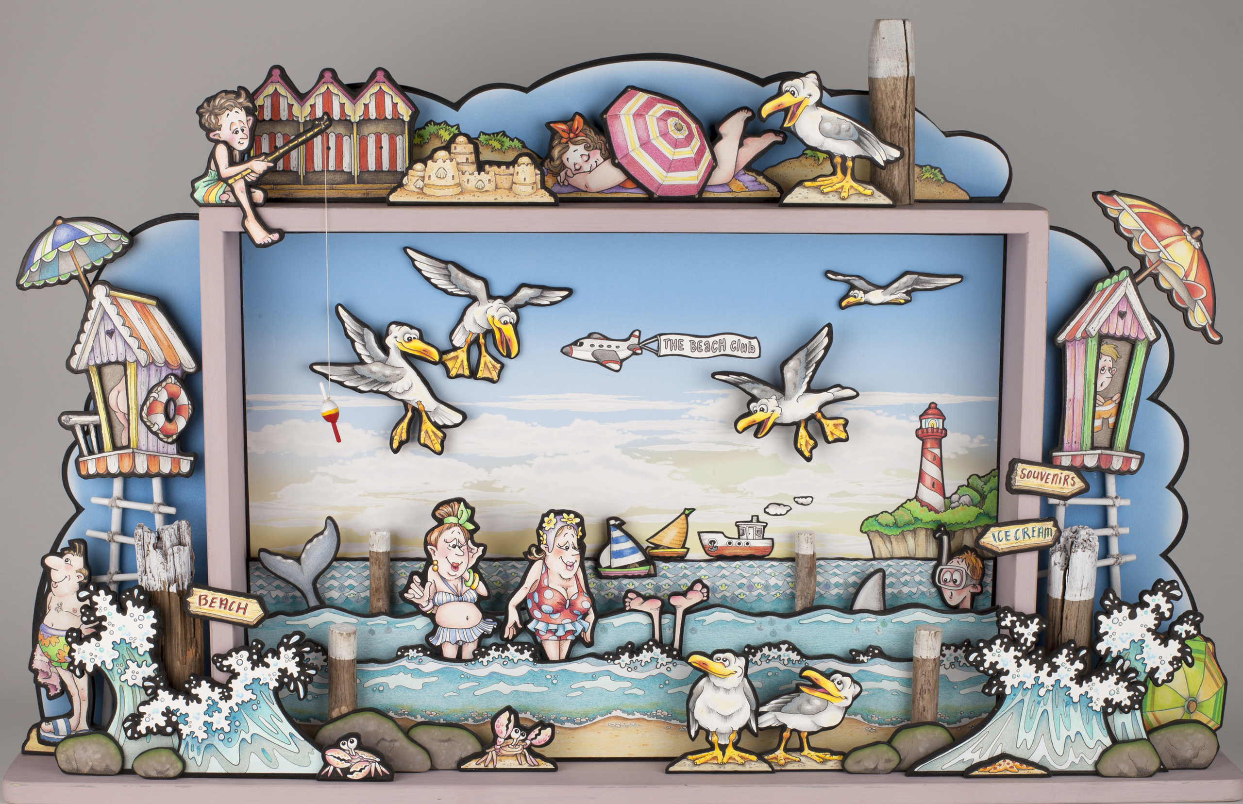 Het liefst maak ik verhalende tekeningen met wat humor, geplaatst in drie-dimensionale houten kistjes. Maar ook beeldhouwwerk, keramiek en textiel. Altijd figuratief met veel details.
